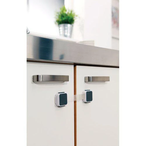 Rozmyslete si nejdříve, kam chcete zábranu umístit. Například na lednici, myčku, sušičku nebo toaletu. Dobře vyčistěte a vysušte místa, kam nalepíte spodní části zábrany. Pro optimální bezpečnost by zábrana měla být umístěna mimo dosah dětí. Odstraňte ochranou fólii ze spodní části zábrany. POZOR: Použité lepidlo potřebuje 24 hodin schnout, aby 100% udrželo zábranu. Pevně spodní část zábrany přitlačte na zvolené místo, abyste ještě zvýšili lepící účinek. Připevněte horní část bezpečnostního pásku a naměřte tak přesně místo, kam přilepíte druhou spodní část. Pro otevření zábrany stiskněte současně horní a dolní šedivá tlačítka a tahem k sobě zábranu uvolníte.