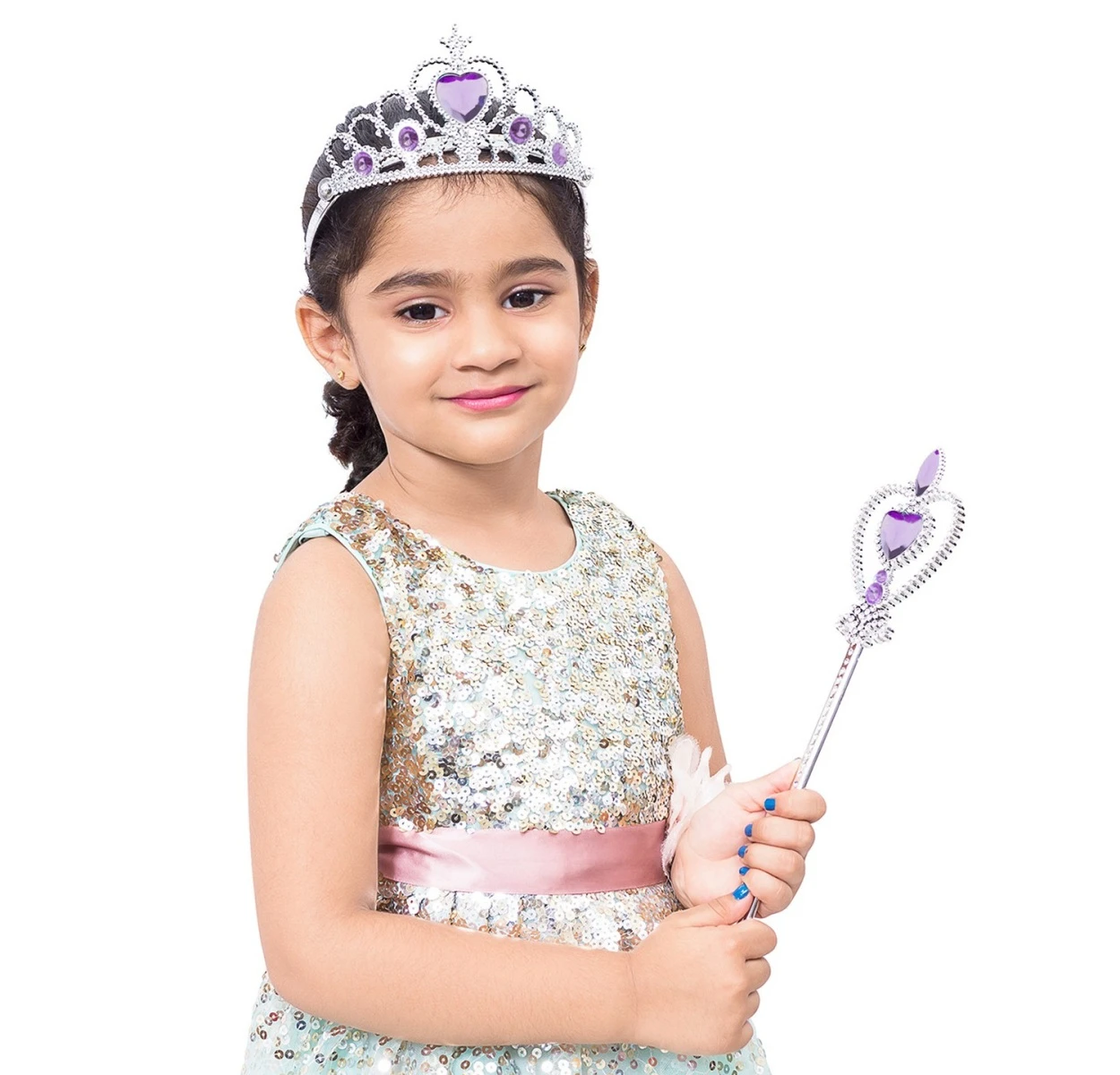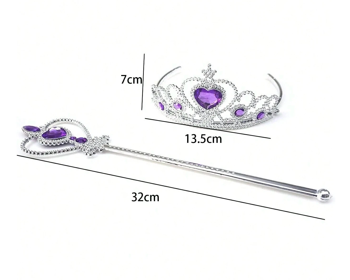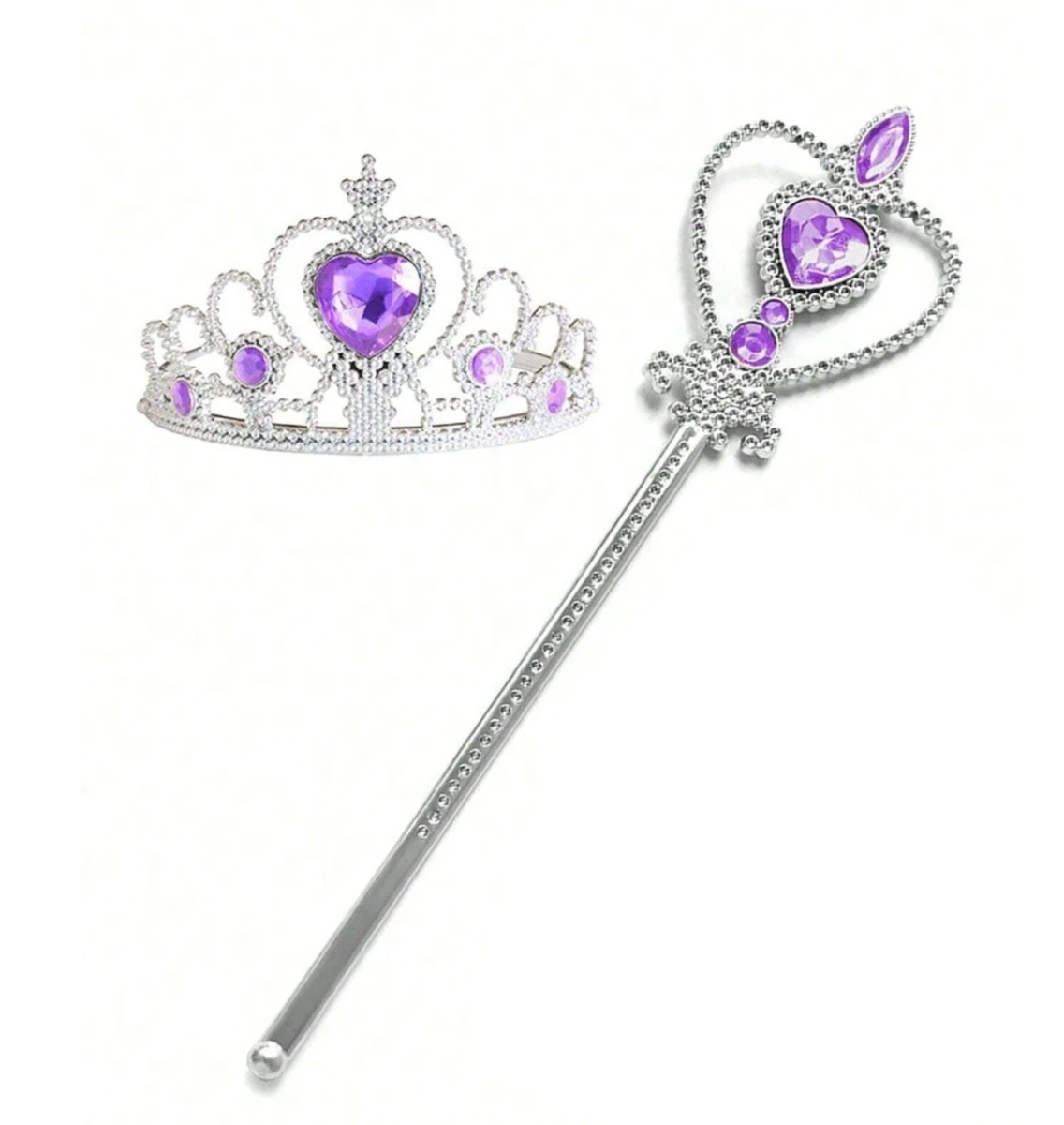 Elegantní korunka a ladící žezlo jsou zdobeny fialovými kamínky ve tvaru srdce, které dodávají celému vzhledu jemný královský nádech. Korunka je lehká a pohodlná na nošení, vyrobená z plastového materiálu s jemnými detaily, které připomínají kouzelnou atmosféru království. Díky pružnému provedení dobře drží na hlavě a je ideální pro dětské hraní i slavnostní chvíle.