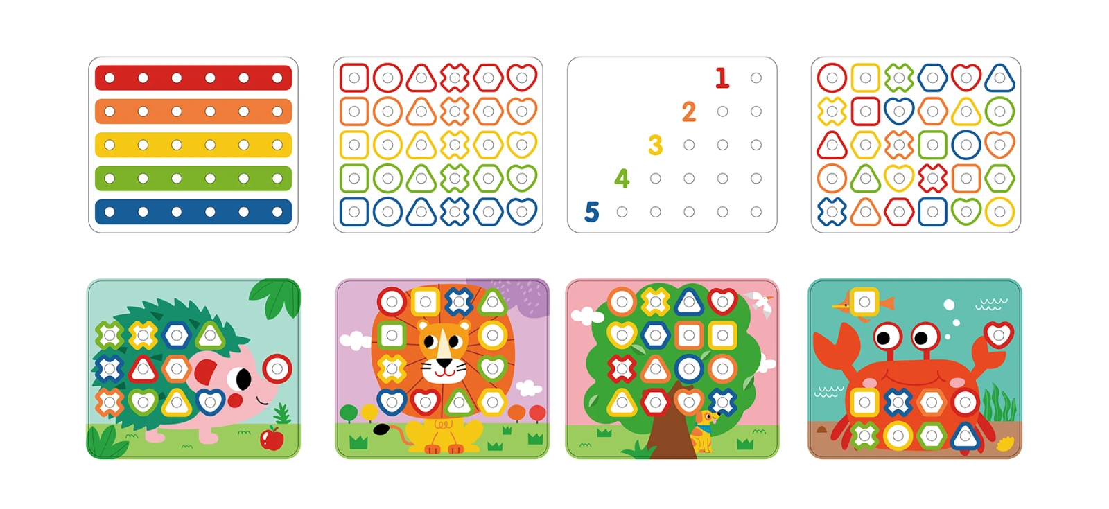 Tato všestranná dřevěná stavebnice nabízí dětem nekonečné možnosti tvoření a zábavy. Na začátku si dítě vybere jednu z 8 předloh, položí ji na dřevěnou desku s otvory a poté do odpovídajících míst zasouvá kolíčky různých barev a tvarů. Jakmile je základ hotový, může začít stavět do výšky s pomocí plochých dílků – nebo si tvořit zcela vlastní návrhy bez předlohy.