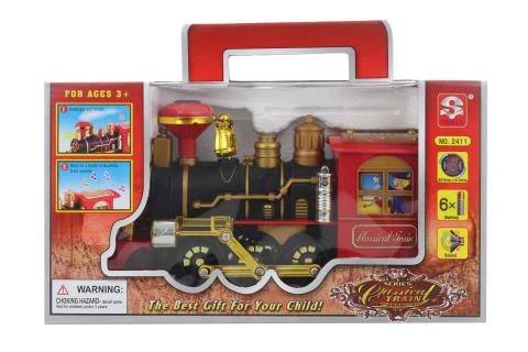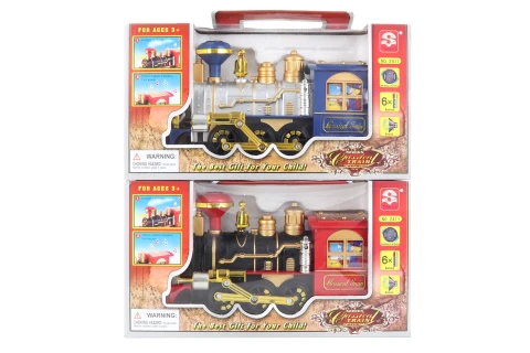 Plastová lokomotiva na baterie. Velikost lokomotivy cca 24 x 13 cm. Svítí, houká a kouří. Lokomotiva má uvnitř elektrickou spirálu a speciální netoxický kouřící olej. Zahříváním spirály se vytváří kouř.
