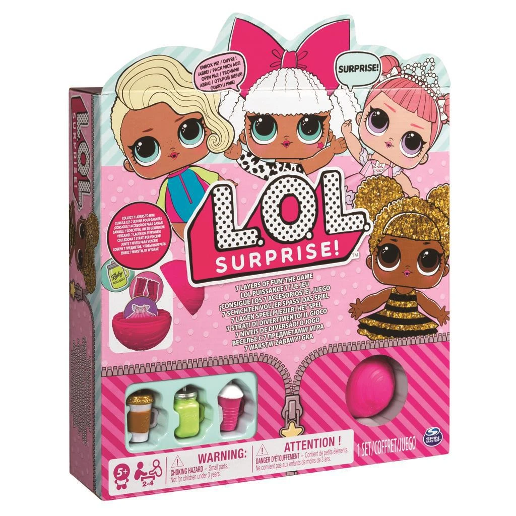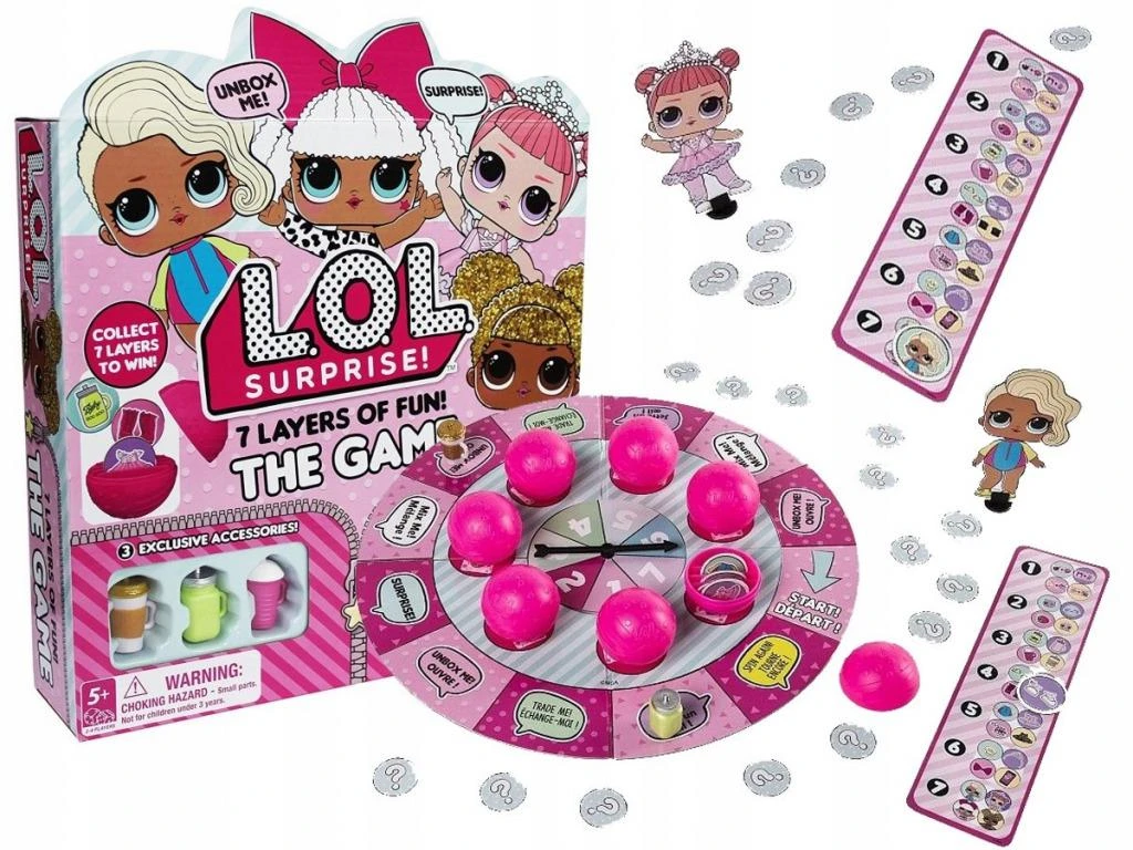herní desku, 7 míčků L.O.L Suprise, 4 figurky lahví, 4 figurky panenek, 4 podstavce, 28 žetonů, 4 hrací kartičky a návod ke hře.
