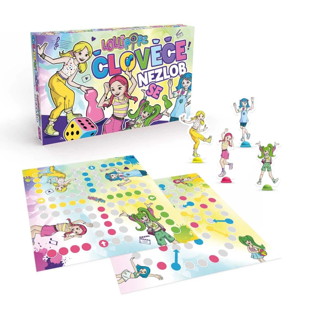 Součástí je oboustranný herní plán – kromě klasické verze „Člověče, nezlob se“ si můžete zahrát i variantu s jednou figurkou, která je ideální pro menší děti nebo rychlou hru. Každý hráč získá sadu čtyř figurek inspirovaných Lollipopz, nechybí ani hrací kostka a jednoduchý návod.