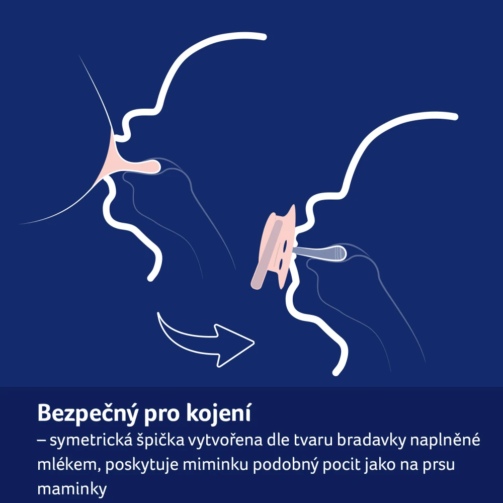 Symetrický tvar špičky vychází z tvaru bradavky naplněné mlékem, která poskytuje miminku známý pocit podobný pocitu z prsu.