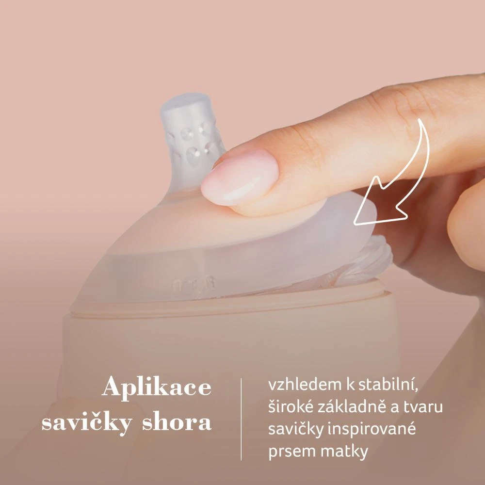 Savička by měla být nasazena z horní části šroubovací objímky (obr. 1, 1a) díky svému jedinečnému designu inspirovanému matčiným prsem. Když je savička nasazena, tvoří s objímkou jednotný celek. Speciálně vyvinutá stabilní základna savičky ze silné vrstvy silikonu se chová jako napjaté prso matky a umožňuje savičce zachovat si svůj tvar a dynamiku.