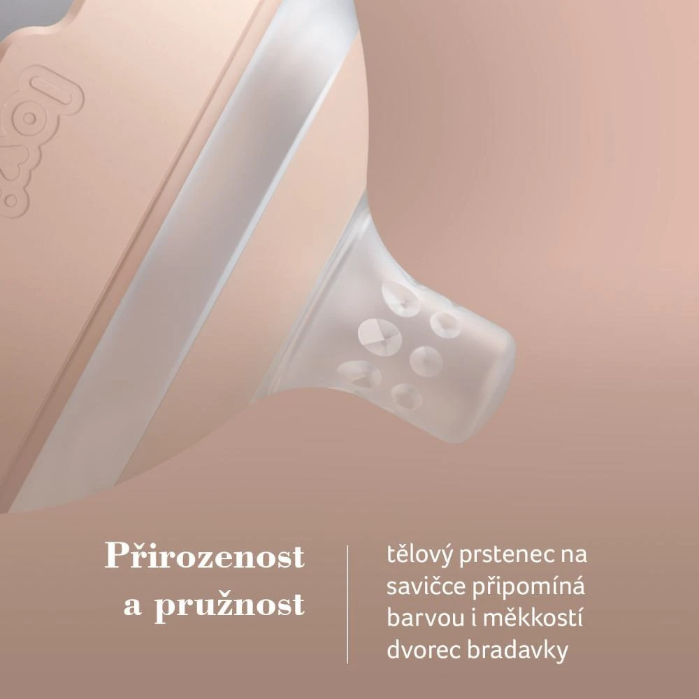 - Přirozenost a elasticita, jemný prstenec na savičce se podobá dvorci bradavky.