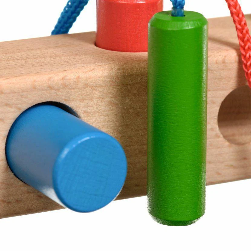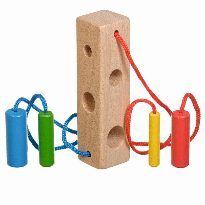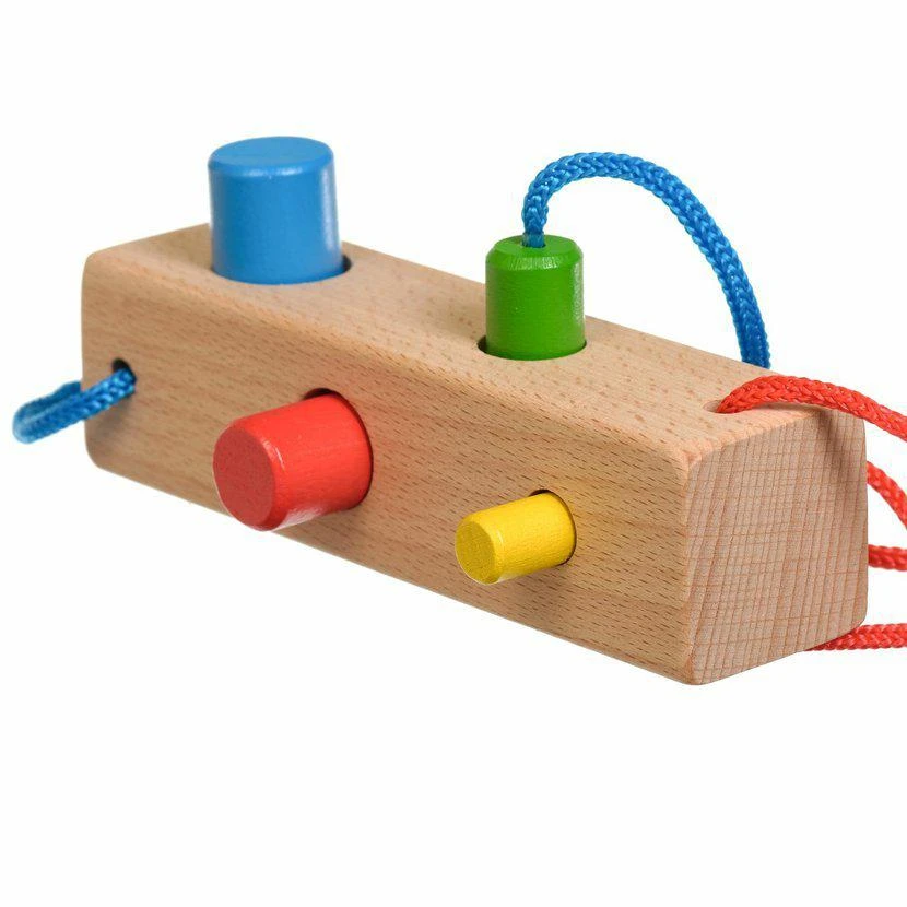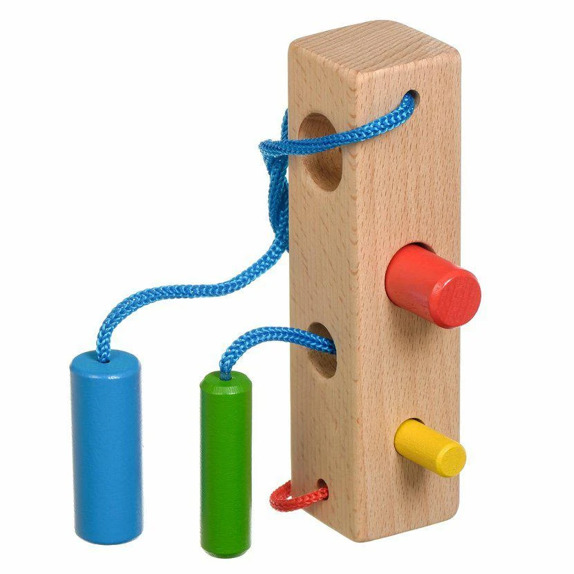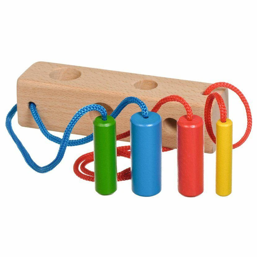 Hra obsahuje 1 perforovaný hranol, 4 kolíky v různách barvách s tkaničkami. Tato hračka je označována jako Montessori pomůcka.