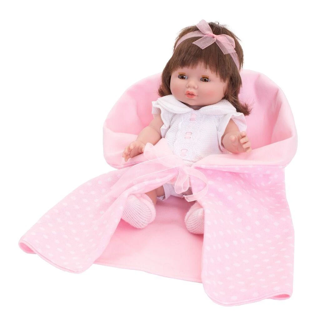 Luxusní španělská dětská panenka-miminko Berbesa Monika. Panenka má vinylové tělíčko, ručičky i nožičky. Magdalena má milou tvářičku, která vypadá jako opravdové miminko. Faldíky na ručičkách, nožičkách a bříšku ještě více připomínají novorozence. Panenka má krásná mrkací hnědá kukadla, řasy, kvalitní vlásky s čelenkou, růžové rtíky, ručičky a nožičky jsou pohyblivé v kloubech. Součástí je roztomiá růžová dečka s mašličkou, ponožky, krásná halenka a krátke kalhoty. Obleček se dá sundat. Tělíčko miminka má jemnou vůni po vanilce. Délka panenky je cca 35 cm. Vhodné pro děti od 3 let. Při výrobě jsou používány výhradně kvalitní materiály.