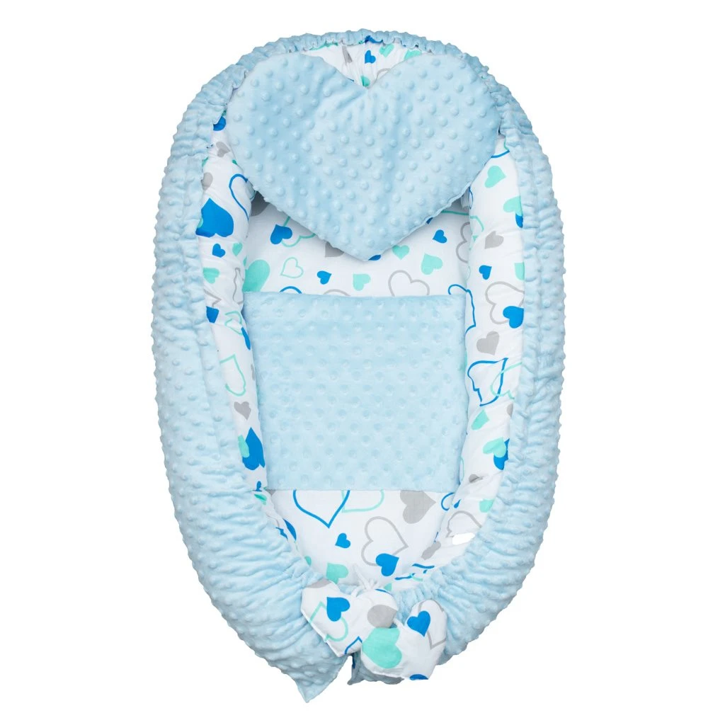 Luxusní hnízdečko s polštářkem a peřinkou New Baby z Minky modrá srdíčka