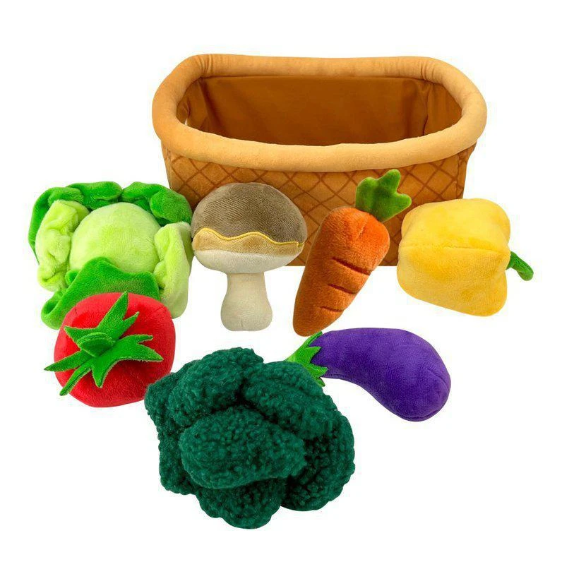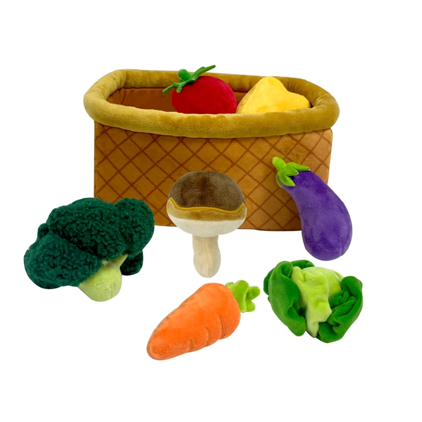 Sada obsahuje košík, 6 imitací zeleniny a jedné houby: hlávkové zelí, mrkev, lilek, brokolice, rajče, paprika a houba.