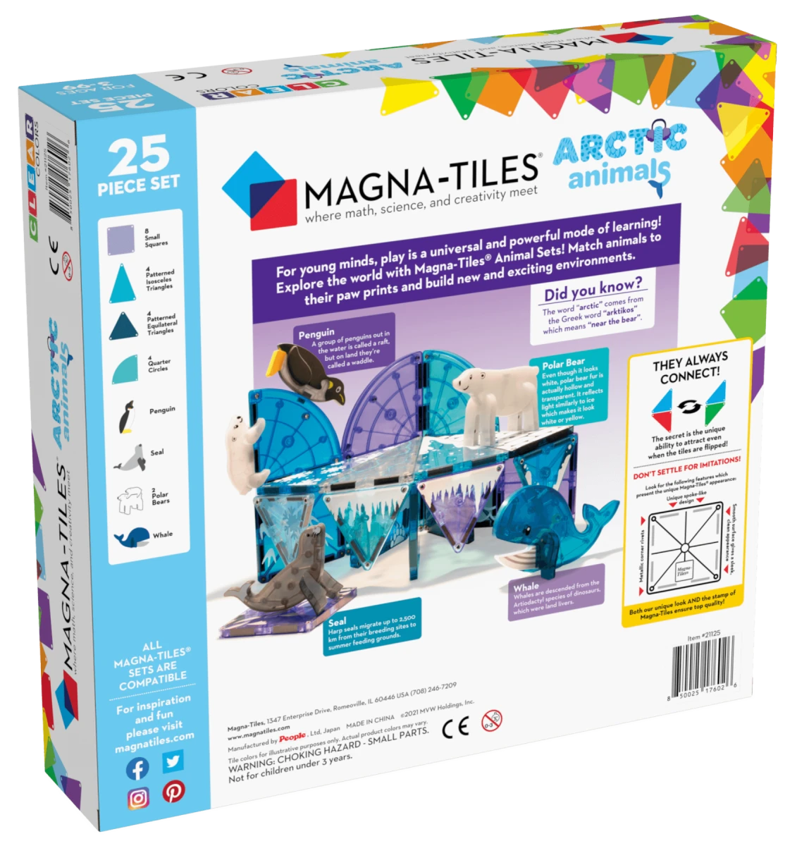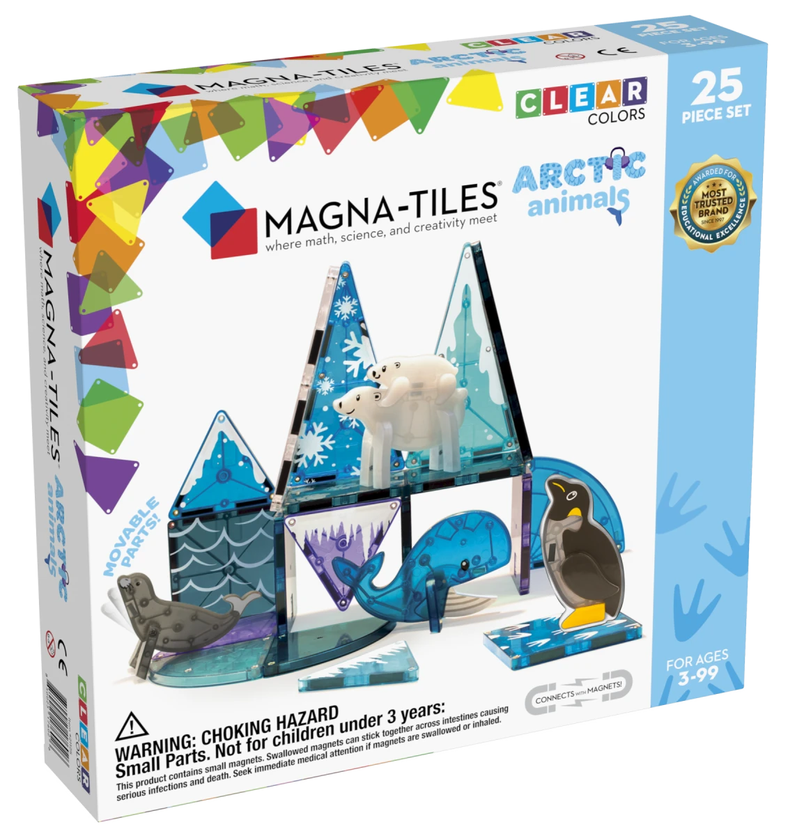 Postavte si svou vlastní arktickou krajinu s fascinující magnetickou stavebnicí MAGNA-TILES® Arctic – 25 dílů. Tato originální sada dětem umožní vytvářet svět plný ledových ploch, zvířecích stop a polárních zvířat. Obsahuje pět roztomilých figurek – tučňáka, tuleně, mládě ledního medvěda, dospělého ledního medvěda a velrybu – spolu s průhlednými magnetickými dílky, které připomínají led a sníh.
