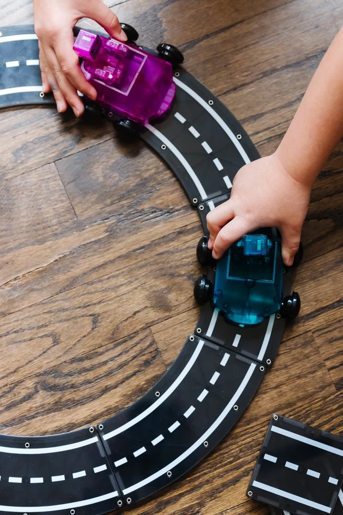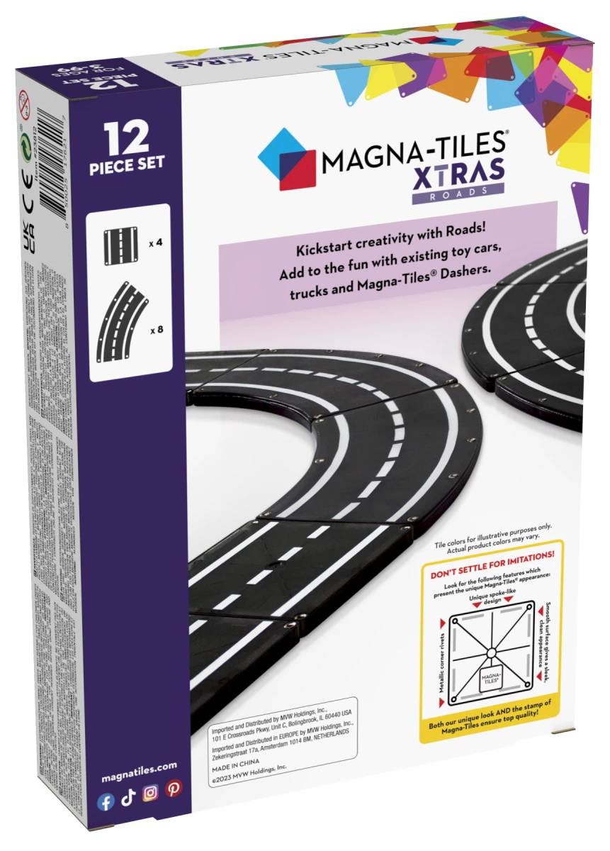 Sada obsahuje vše potřebné k dokončení dokonalého kruhu (8 křivek) nebo oválné závodní dráhy (8 křivek + 4 čtverce). Stavebnice je kompatibilní se všemi ostatními sadami Magna-Tiles, takže možnosti kombinování a rozšiřování jsou téměř nekonečné.
