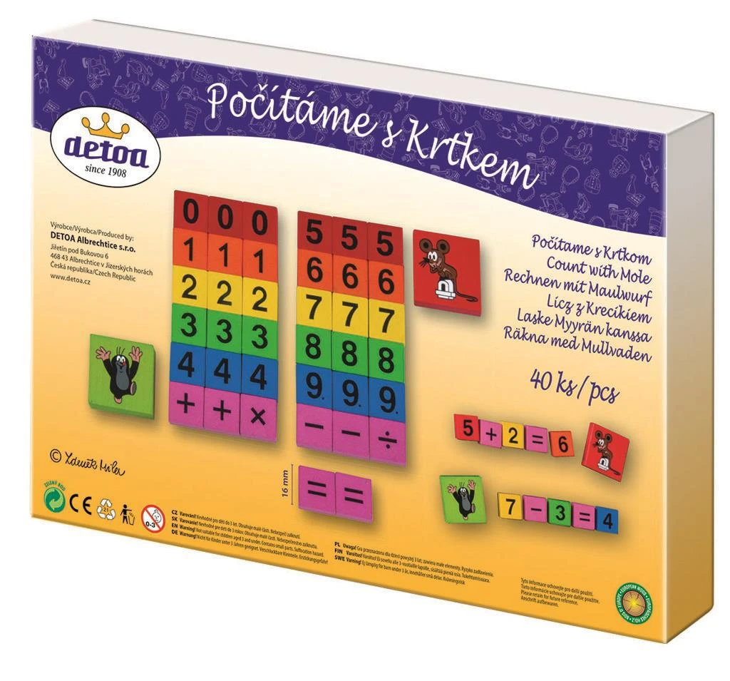 Stavebnice Detoa Počítáme s krtkem je určena pro malé děti učící se poznávat jednotlivé číslice. Jednoduché dřevěné provedení zajišťuje výdrž této hračky a umožňuje lepší manipulaci se samotnými čísly. Děti se takto mohou zábavnou formou naučit skládat čísla k sobě, případně tvořit jednoduché příklady.