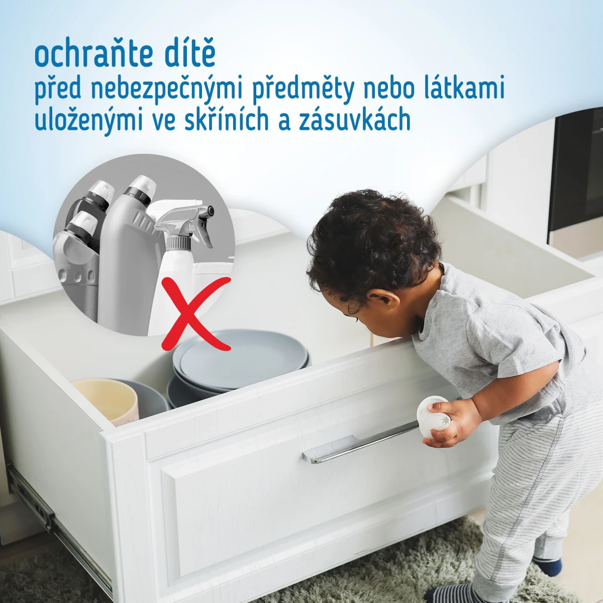 DOPLŇUJÍCÍ INFORMACE: Vždy postupujte podle přiložených pokynů. Pomůcka je určena pro domácí použití. Nepoužívejte výrobek jiným způsobem, než pro jaký byl určen a jaký je popsán v přiložených pokynech. Výrobce neodpovídá za škody vzniklé v důsledku použití výrobku v rozporu s jeho určením. Upozorňujeme, že některé děti mohou ochranu odstranit. Z tohoto důvodu doporučujeme pravidelně kontrolovat stav bezpečnostní pomůcky – zámku.