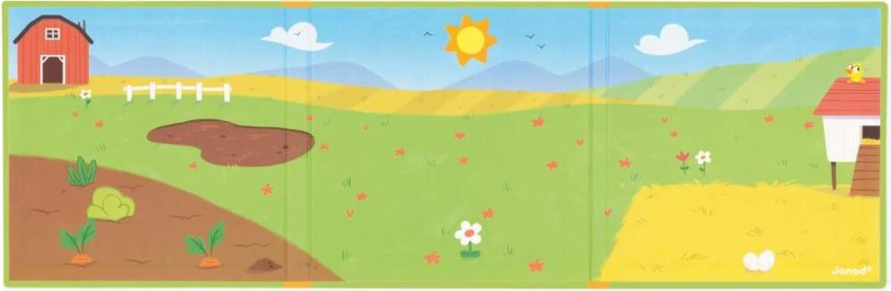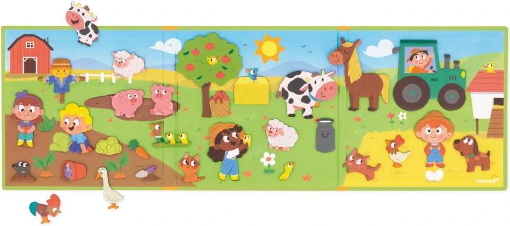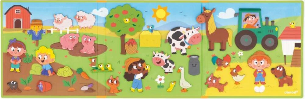 Knihu otevřete a najdete v ní velké magnetické pozadí a 30 magnetek zobrazujících farmářská zvířátka a dekorace, které jsou ideální pro doplnění scény jakéhokoli příběhu! Magnetická hračka je vyrobena z kartonu FSCTM.