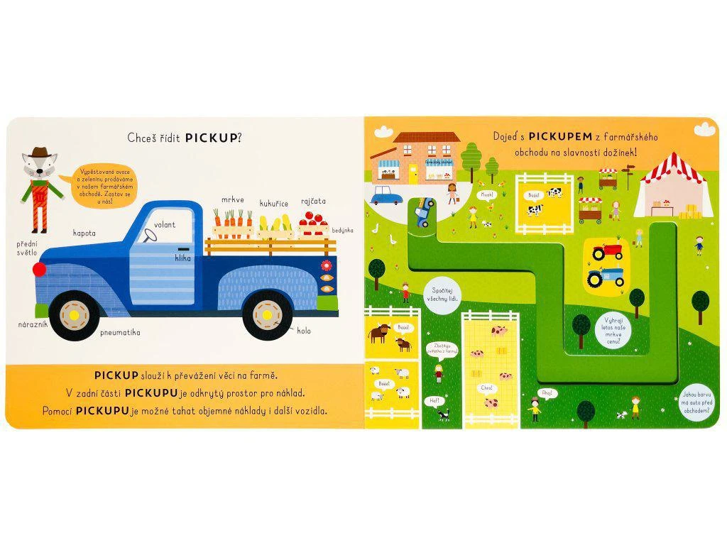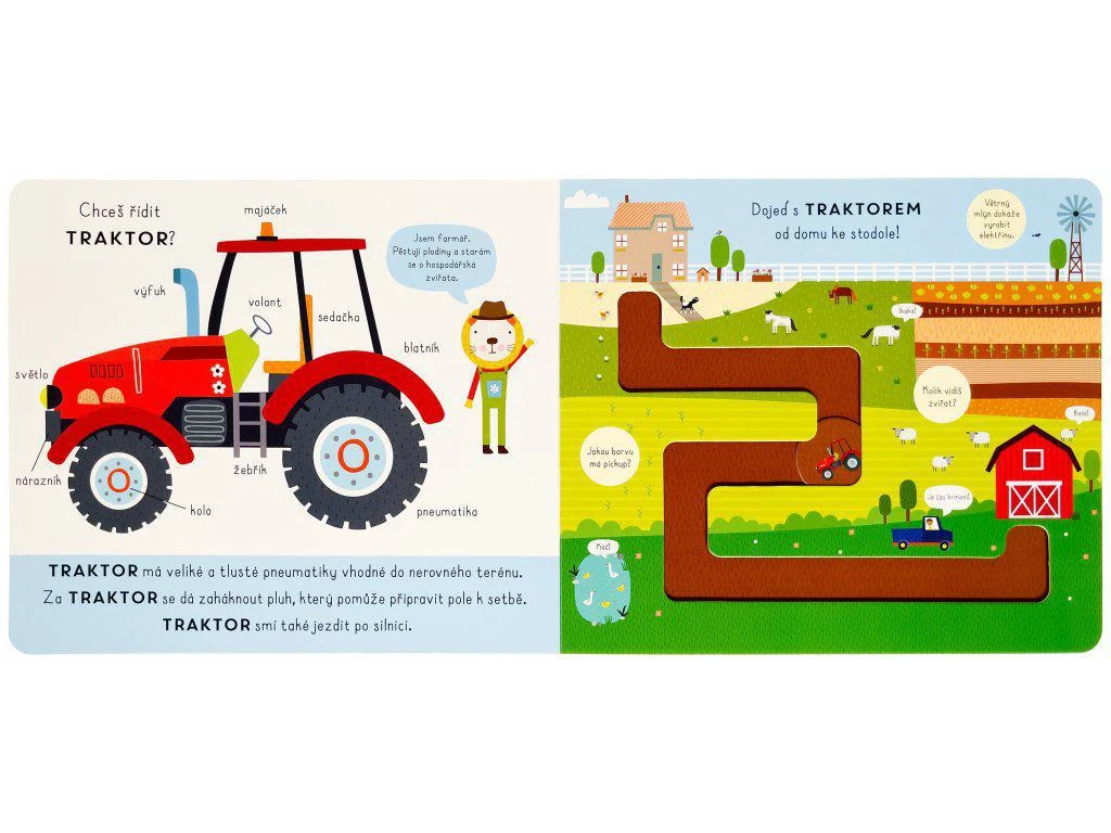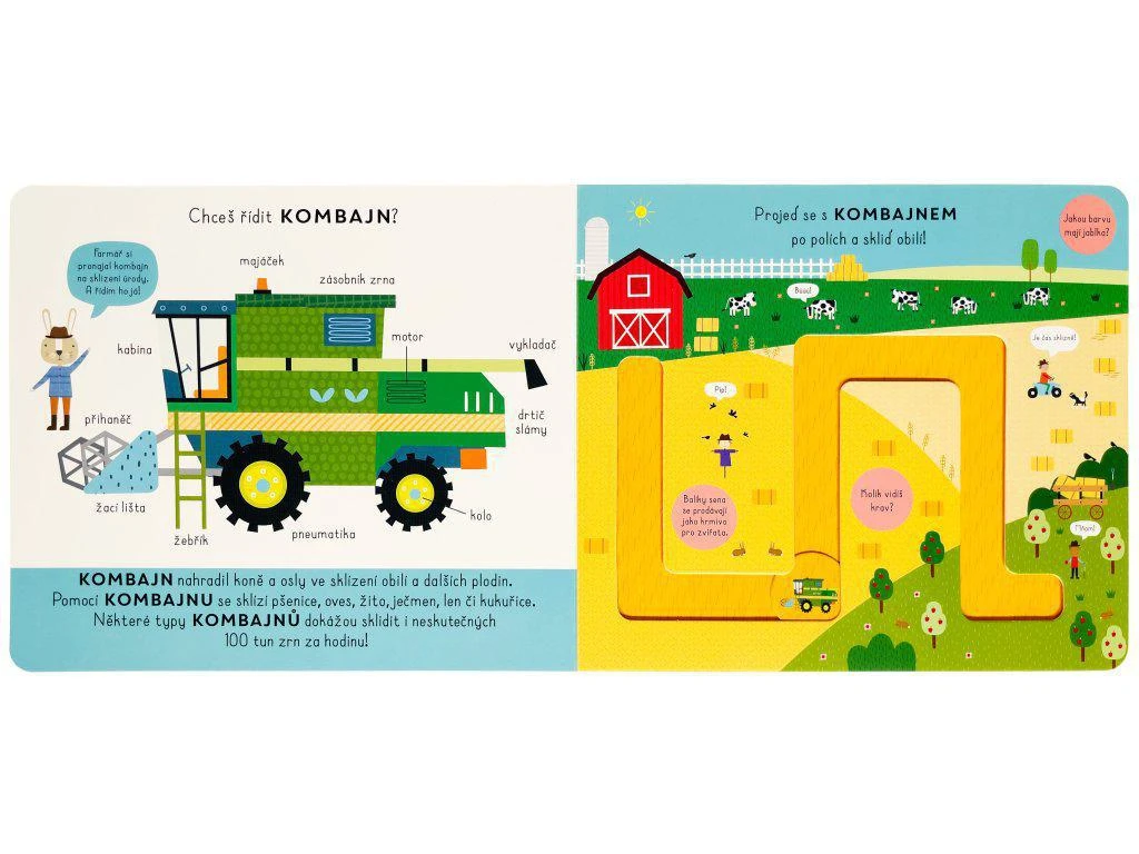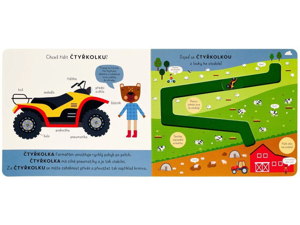 Zjisti o vozidlech na farmě spoustu zajímavostí a pomocí popisků u každého z nich se dozvíš, z čeho se skládají. Poté se s posuvnými kolečky můžeš projet po trasách po farmě a poznat i ji! Víš, kolik toho dokážou sklidit ty nejlepší kombajny na světě? K čemu je na farmě dobrá čtyřkolka a dodávka? To a spoustu dalšího se dozvíš v tomto hravém, ale i velmi poučném leporelu s posuvnými kolečky.