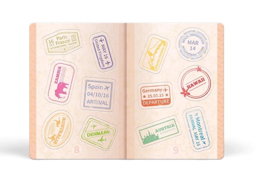 - 1 cestovní pas + 12 odnímatelných razítek