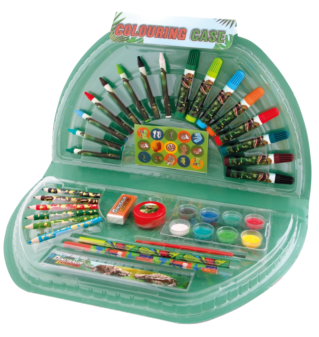 Součástí kufříku jsou fixy, voskovky, pastelky, vodové barvy, obyčejné tužky, štětec, pravítko, ořezávátko, guma a také samolepky s dinosaury, které dodají každému výtvoru jedinečný styl.