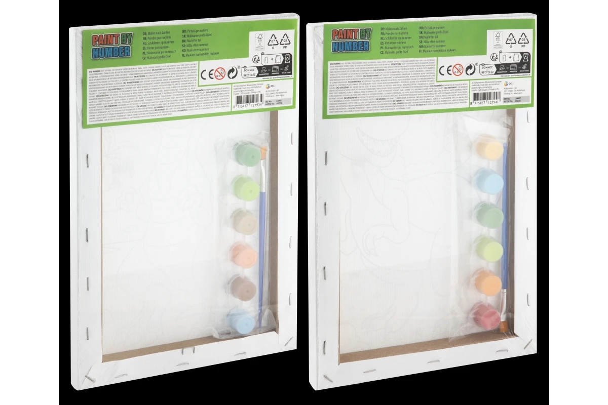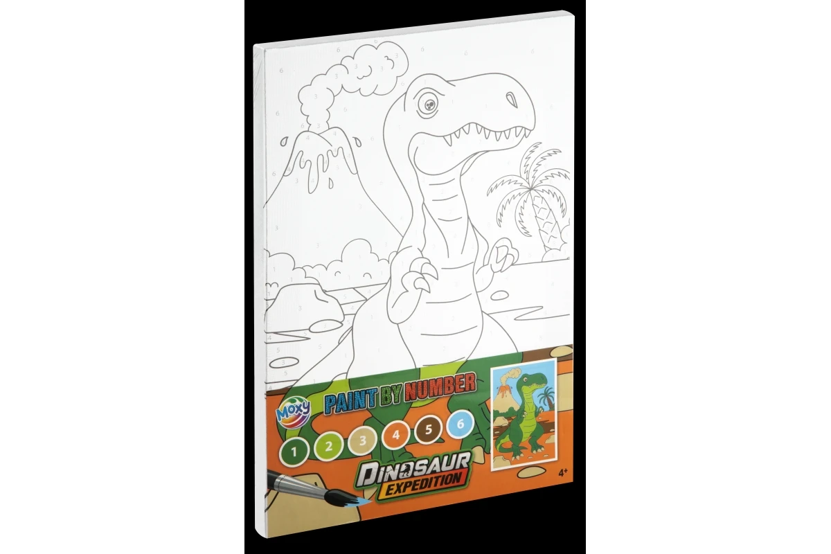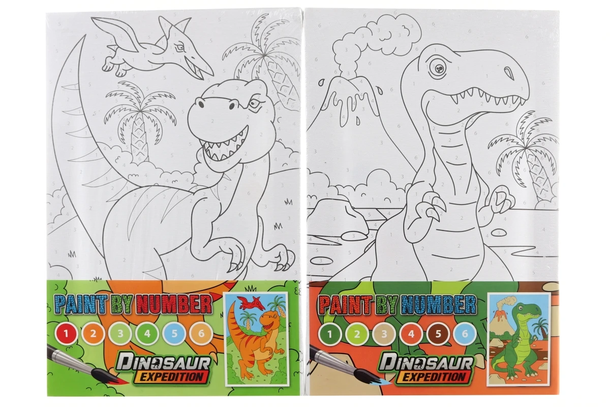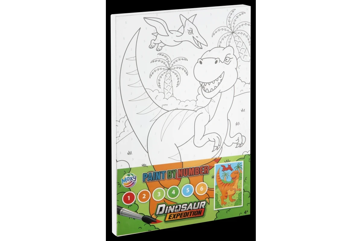 Malování podle čísel s motivem dino. Sada obsahuje plátno s obrázkem s rámečkem, paletku se 6 barvičkami a štěteček.