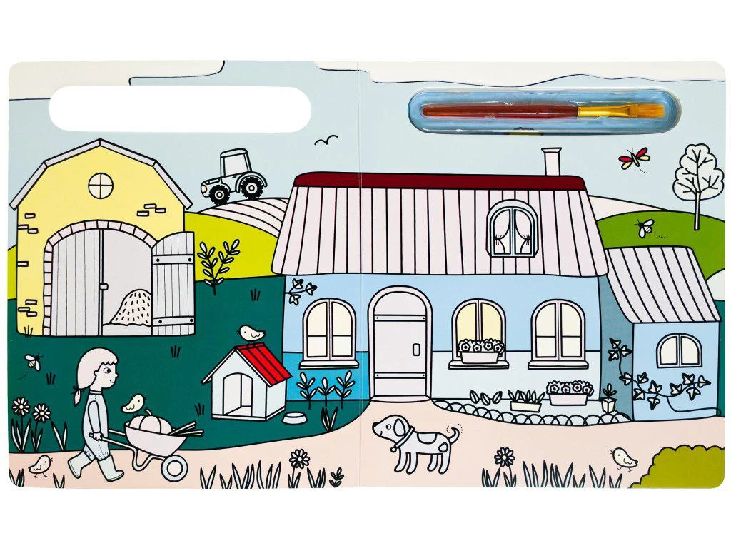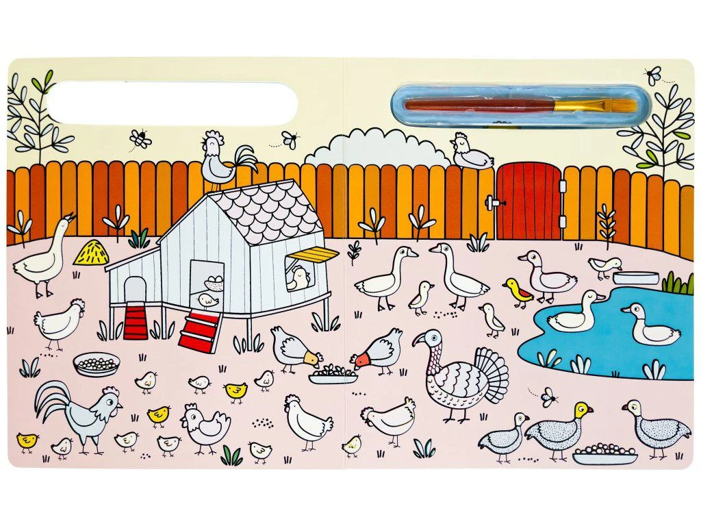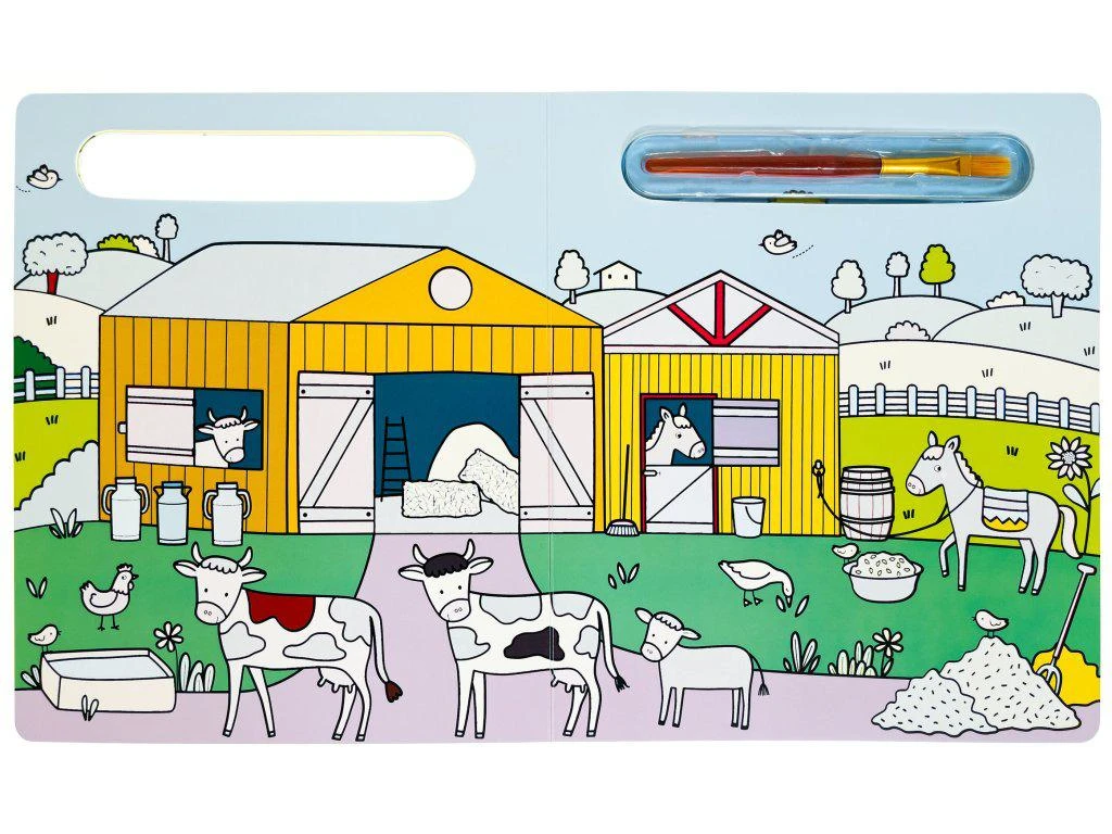 Knížka s pevnými stránkami je plná obrázků zvířat z farmy, které jsou částečně barevné. Bílé části lze velice snadno vybarvit - stačí namočit štětec, který je součástí knihy, do vody a barva se jako zázrakem na bílém podkladě objeví. To ale není všechno! Vymalovaný obrázek jako kouzlem zmizí, a tak jej dítě může vymalovávat stále dokola. Zkontrolujte, zda dítě drží štětec správně. S touto knížkou si bude procvičovat jemné motorické schopnosti a koordinaci oka a ruky.