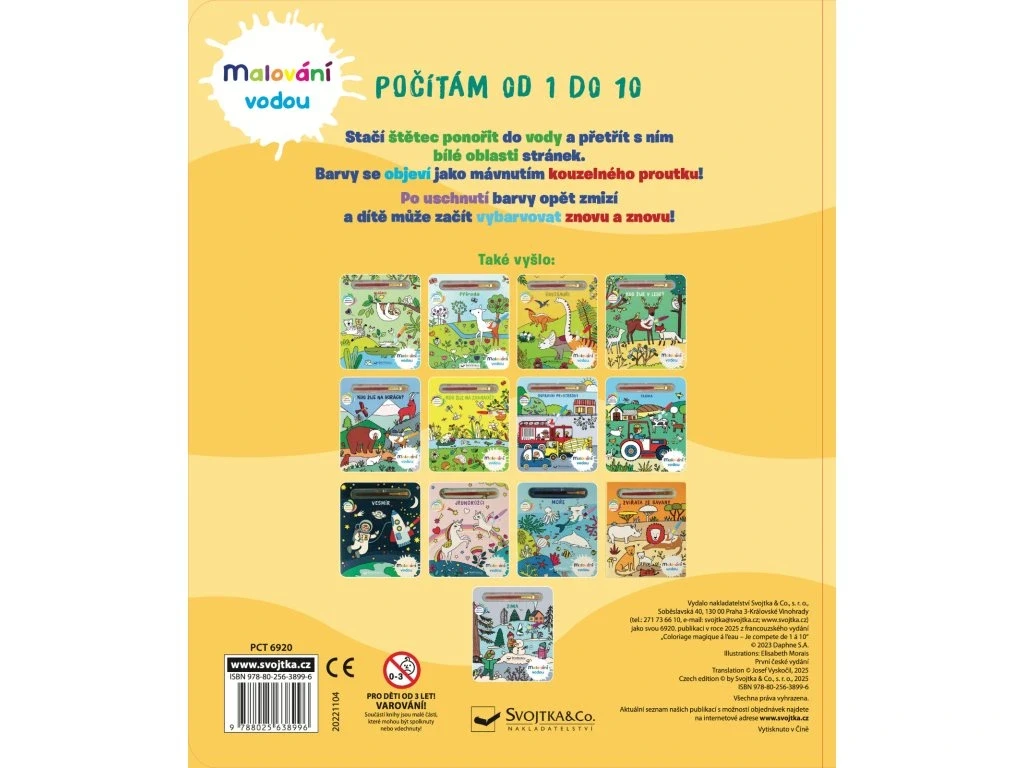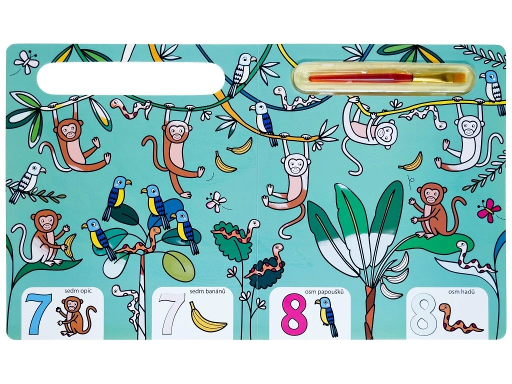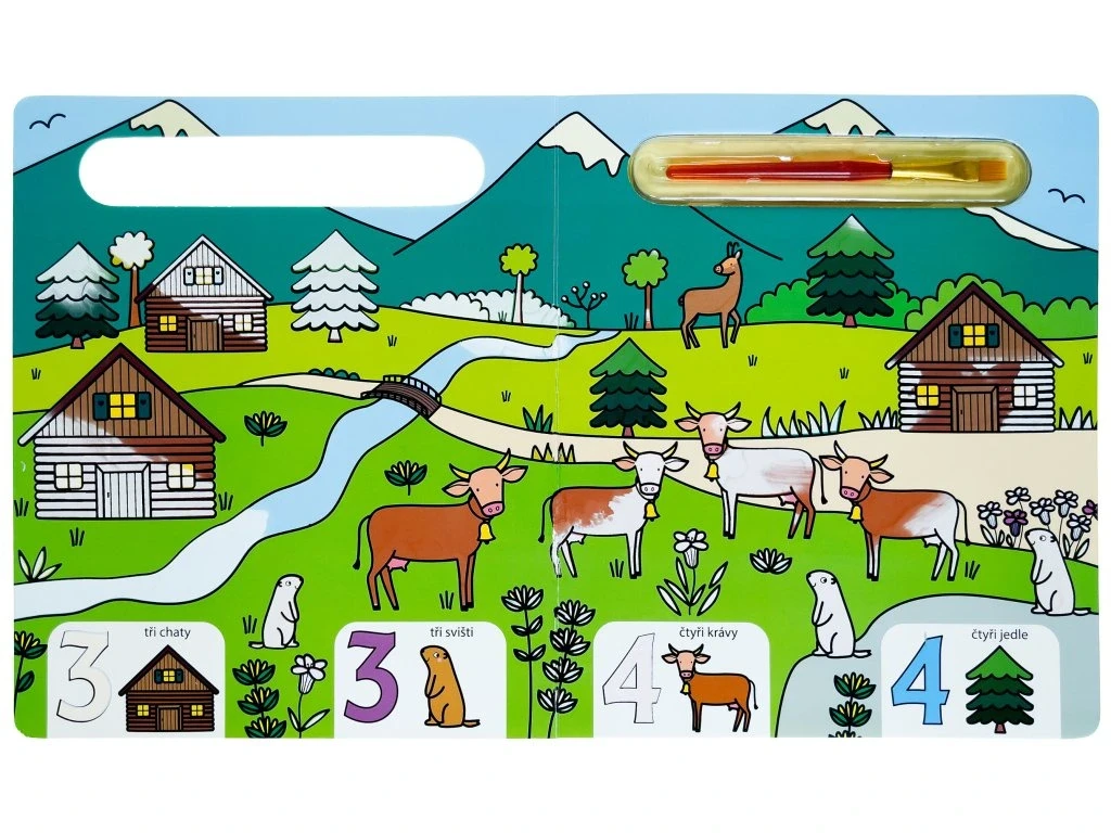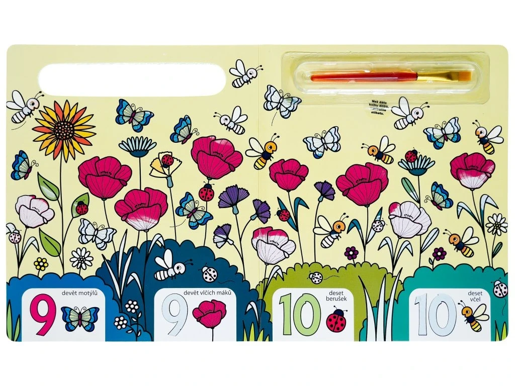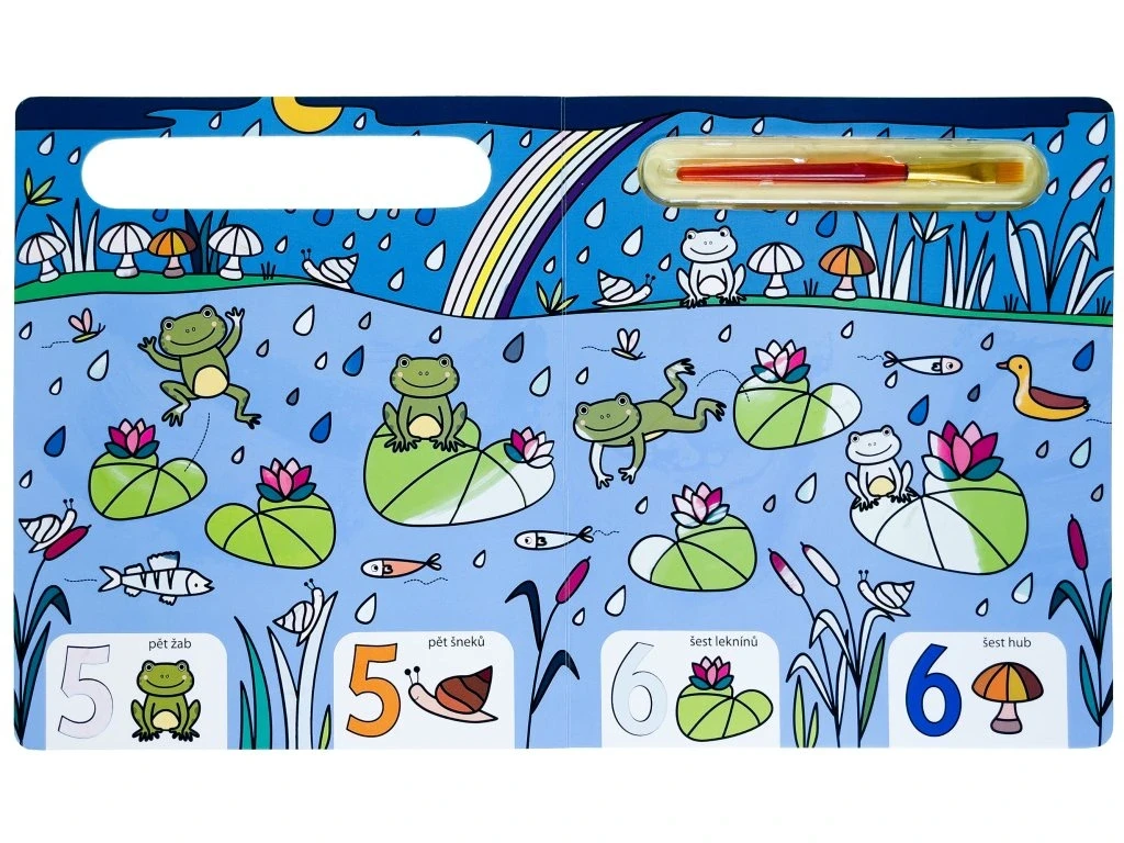 Knížka s pevnými stránkami je plná obrázků z přírody, které jsou částečně barevné. Bílé části lze velice snadno vybarvit - stačí namočit štětec, který je součástí knihy, do vody a barva se jako zázrakem na bílém podkladě objeví. To ale není všechno! Vymalovaný obrázek jako kouzlem zmizí, a tak jej dítě může vymalovávat stále dokola. Zkontrolujte, zda dítě drží štětec správně. Současně si dítě může osvojit poznávání čísel od 1 do 10 a obrázky hledat i spočítat! S touto knížkou si bude procvičovat jemné motorické schopnosti, koordinaci oka a ruky a základy počítání.