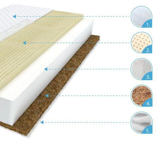Složení vstev: 1,5 cm kokosová vložka, 2 cm latex (paměťová pěna), 8 cm molitan