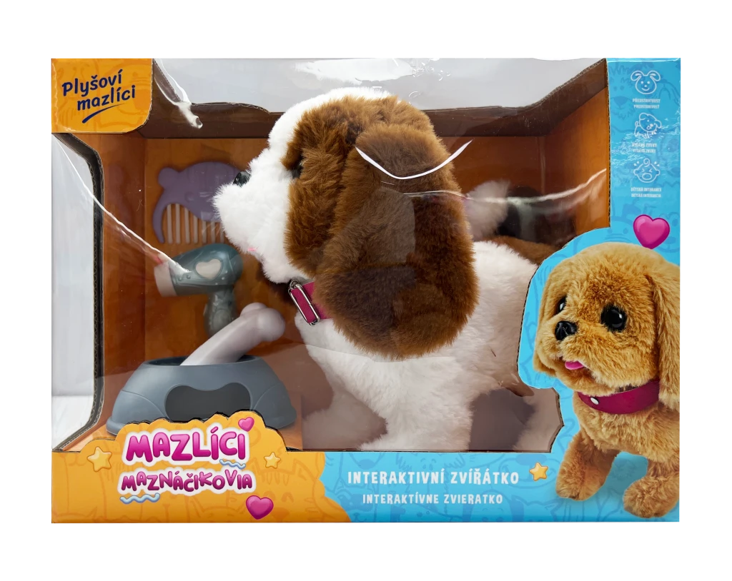 Mazlíci jsouí zvířátka, která pomáhají rozvíjet představivost a dětskou interakci. Mazli se se svým plyšovým mazlíkem, starej se a pečuj o něj! Balení obsahuje hnědobílého pejska Ťapku, hřebínek, mističku na jídlo a kostičku. Pejsek chodí, vydává zvuky a hýbe ocáskem. Představujeme interaktivní mazlíčky, kteří přinášejí dětem radost a zábavu při péči o jejich vlastní zvířecí přátele! Pejsek Ťapka je ideální pro rozvoj představivosti a dětské interakce. S těmito plyšovými mazlíčky si děti mohou užívat spoustu zábavy, starat se o ně a pečovat o jejich potřeby.