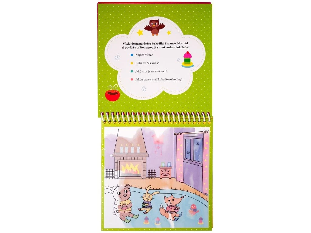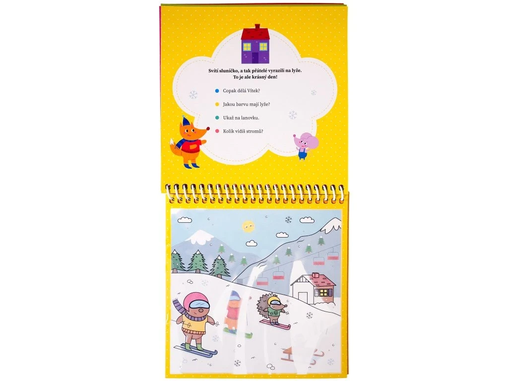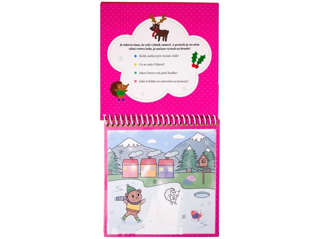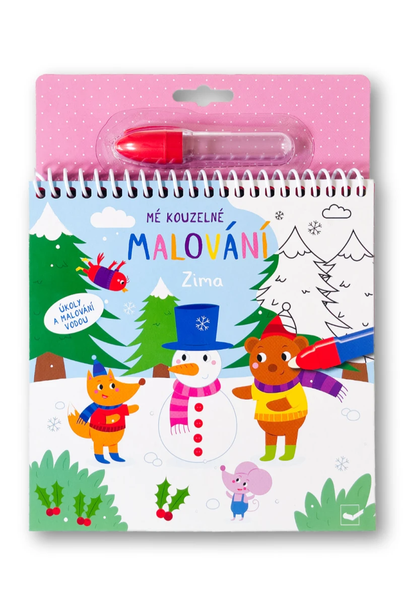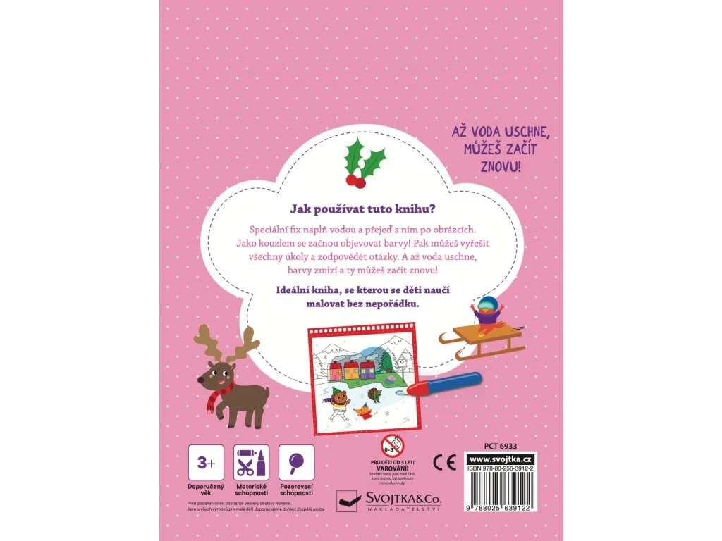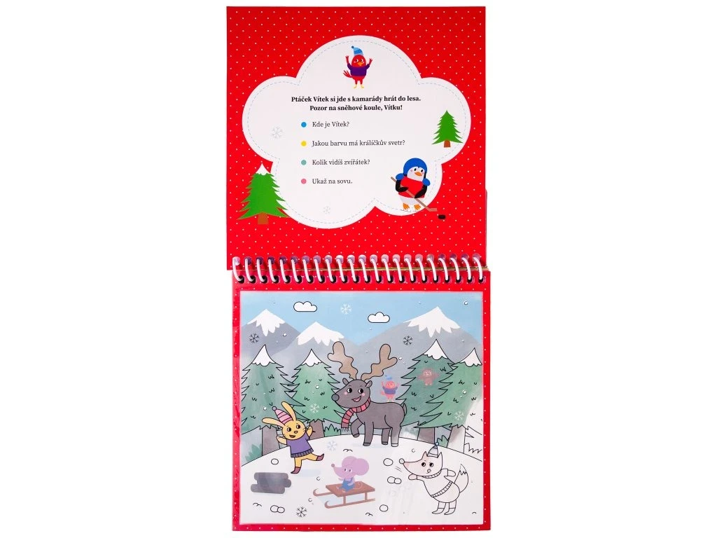 Naplň speciální fix vodou a ponoř se do kouzelného zimního světa. Můžeš vybarvovat stránky této roztomile ilustrované knížky zas a znovu, bez nepořádku. Na stránkách tě čekají zábavné úkoly a otázky inspirované zimním obdobím a dobrodružstvím ptáčka Vítka. Dokážeš najít Vítka v zasněženém lese? Spočítej sněhové vločky na zamrzlém rybníku, kde se bruslí! Poznáš, jakou barvu má králíčkův svetr a kde se skrývá liška? Jakmile voda uschne, barvy zázračně zmizí a ty můžeš vybarvovat a řešit zimní hádanky pořád dokola! Ideální pro rozvoj pozornosti, jemné motoriky a poznávání zimy.
