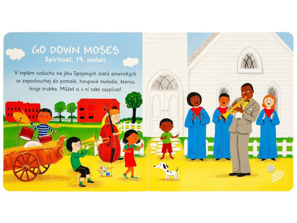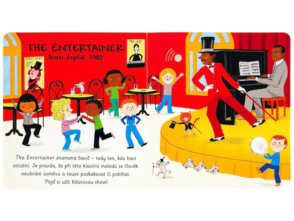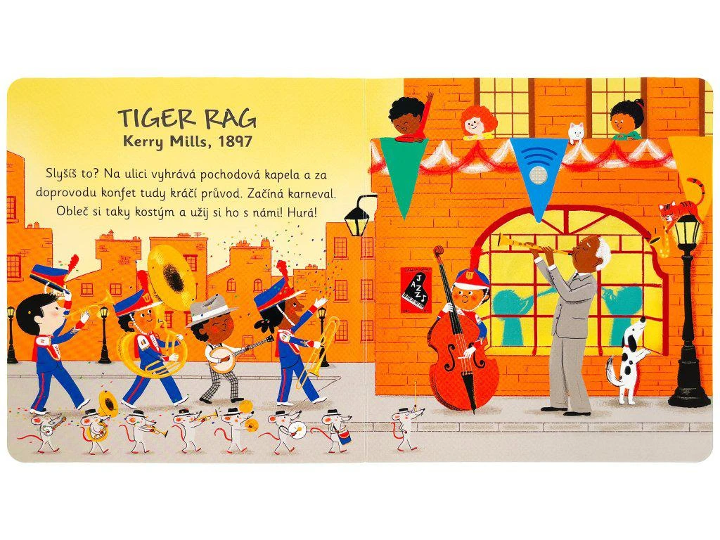 Zaposlouchej se do ukázek skladeb, které formovaly jazz, a seznam se s tímto hudebním žánrem. Stiskni tlačítko a přenes se do Spojených států amerických, do černošských kostelů, hudebních klubů nebo třeba na karnevalový průvod. Tam všude uslyšíš veselé melodie pro trubku, klavír nebo violoncello. Zatanči si charleston nebo si jazzově zaimprovizuj. Pestré ilustrace doplňuje stručné povídání o skladbách. Na každé dvoustraně je možné stisknout tlačítko a poslechnout si hudební pasáž, o níž se v knize právě píše. Kniha je tak skvělým interaktivním seznámením s jazzovou hudbou.