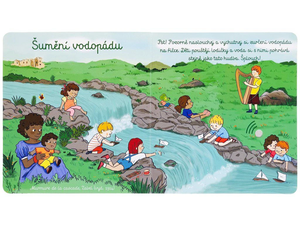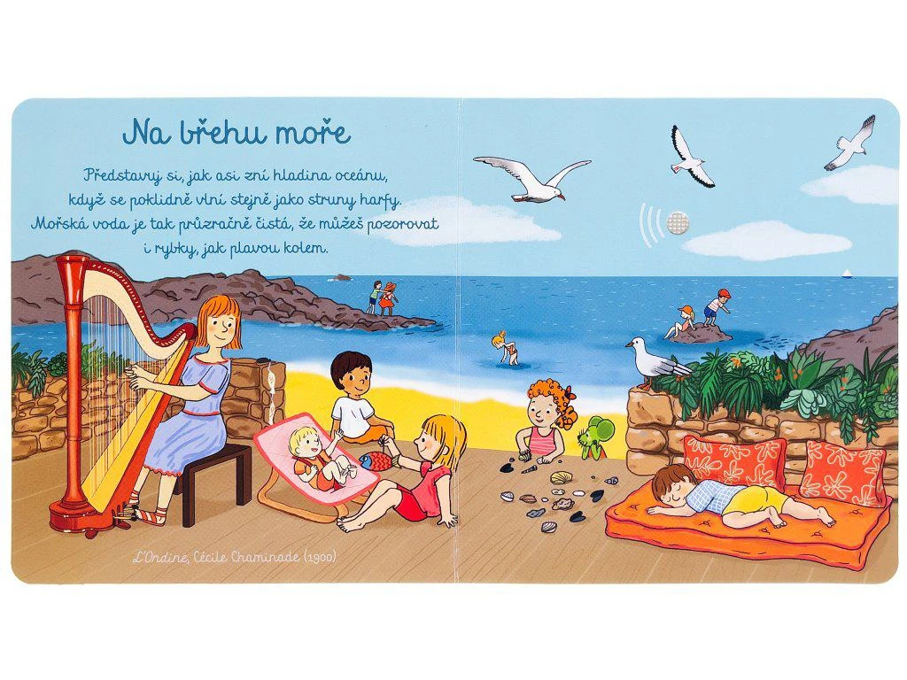 Objevte kouzlo klasické hudby s touto unikátní zvukovou knížkou pro nejmenší! Každá dvojstránka skrývá malé tlačítko, které po stisknutí přehraje nádhernou melodii na harfu. Toto knižní dílko nabízí jemný způsob, jak pomocí hudby zklidnit dítě a pomoct mu usnout. Vychutnejte si spolu s vaším dítětem uklidňující chvíle při poslechu skladeb, jako je Kánon D dur od Pachelbela, Valčík A dur od Brahmse nebo tradiční anglická píseň Greensleeves. Vysoko v oblacích, na břehu moře, u šumícího vodopádu, za letního večera nebo při tanci hvězd na jasné noční obloze - všechny tyto scenérie přináší uklidňující atmosféru díky krásným ilustracím a nádherné hudbě, které je doprovází. Zvukové leporelo je vhodné pro děti od 1 roku. Stačí stisknout tlačítko, poslechnout si melodii na harfu a nechat se unášet klasickými skladbami, které jsou ideální pro usínání.