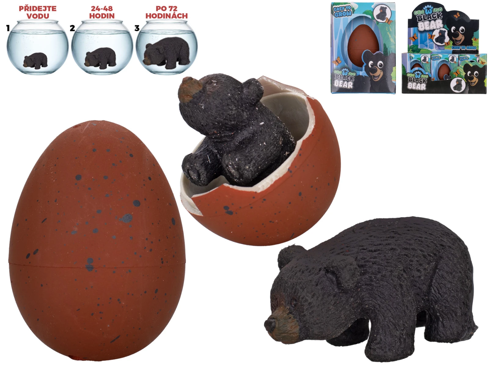 Líhnoucí a rostoucí medvěd je zábavná a překvapivá hračka, která děti nadchne svým kouzelným efektem. Stačí vložit vajíčko do nádoby s vodou a během několika hodin začne skořápka praskat. Postupně se z ní vylíhne roztomilý černý medvěd, který se po vylíhnutí ve vodě dále zvětšuje.