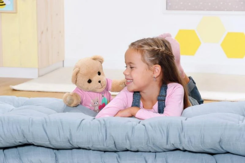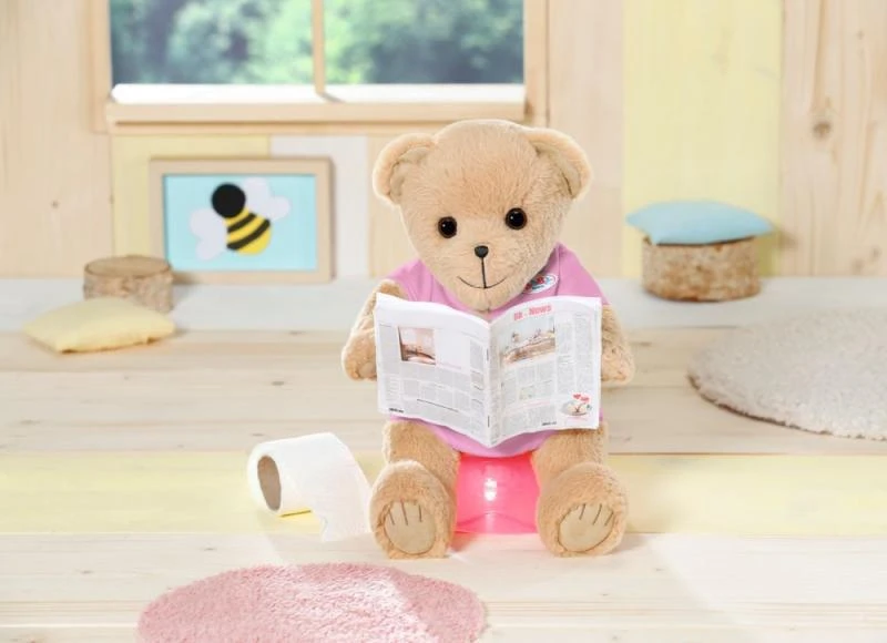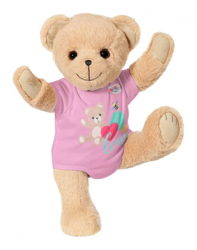 Malý medvídek se sladkým úsměvem má měkké tělíčko. Je oblečen do slušivého růžového oblečku. Má svou vlastní módní kolekci a medvědí doplňky, ale může nosit i téměř cokoliv, co nosí panenka BABY born a také může používat její doplňky. Medvídek je navržen tak, aby mu sedělo téměř všechno oblečení pro BABY born velikosti 43 cm. Jen její botičky neobuje. Ale který medvídek by potřeboval botičky? Díky pohyblivým ručičkám a nožičkám a otáčecí hlavičce ho lze snadno převlékat. Je velmi pohyblivý, a proto je skvělým společníkem pro hraní různých her. Kdo jako první něco napíše do knížky přátelství? Součástí knížky přátelství je i arch samolepek.