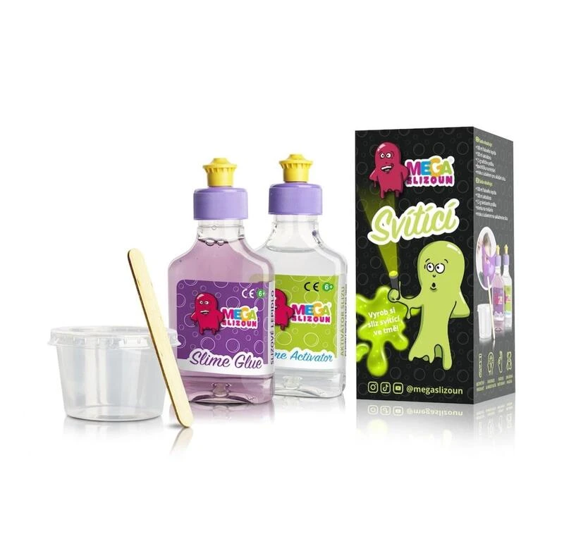 Sliz, který svítí ve tmě! Sada Megaslizoun SVÍTÍCÍ vám umožní jednoduše vyrobit svůj vlastní zářivý sliz. Stačí smíchat fialové lepidlo, aktivátor a svítící prášek – po nabití pod lampičkou sliz ve tmě opravdu svítí. Výroba slizu děti baví, rozvíjí jejich fantazii, jemnou motoriku, smyslové vnímání a zároveň působí antistresově. Produkty Megaslizoun jsou bezpečné, nezávadné, netoxické, vyrobené na vodní bázi a splňují evropské normy pro bezpečnost hraček (směrnice 2009/48/ES, REACH).