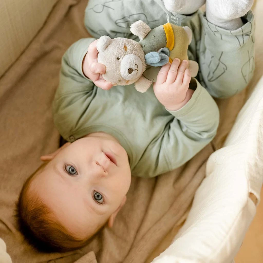 Vycpaný plyšák s chrastítkem podporuje hmat, sluch a také motoriku dítěte. Děti rychle pochopí, co dělat, aby hračka chrastila. Se zajímavými strukturami materiálů a stimulujícími zvuky tato hračka vaše děťátko jen tak neomrzí.