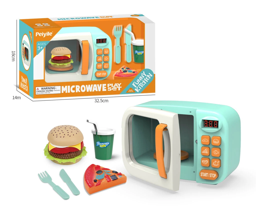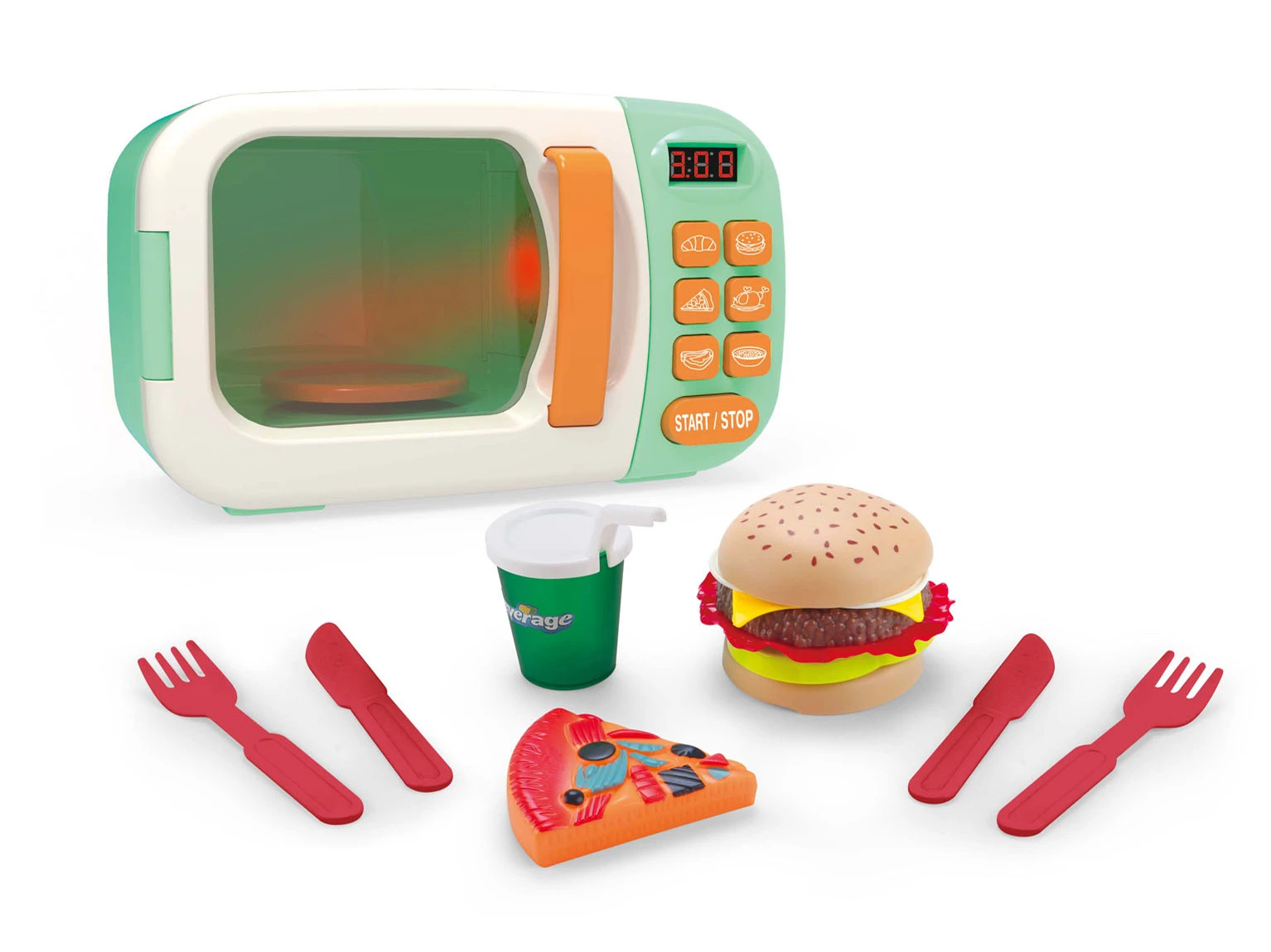 Obsahuje mikrovlnku, hamburger, kousek pizzy, příbor a pití. Vydává zvukové a světelné efekty na baterie 3xAA, které jsou součástí balení.