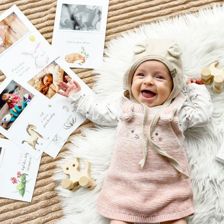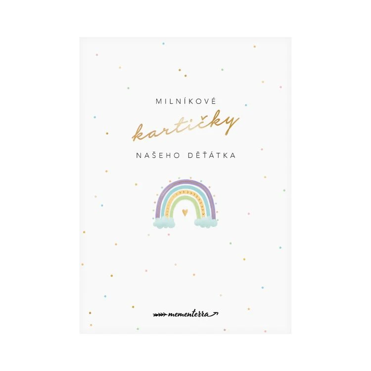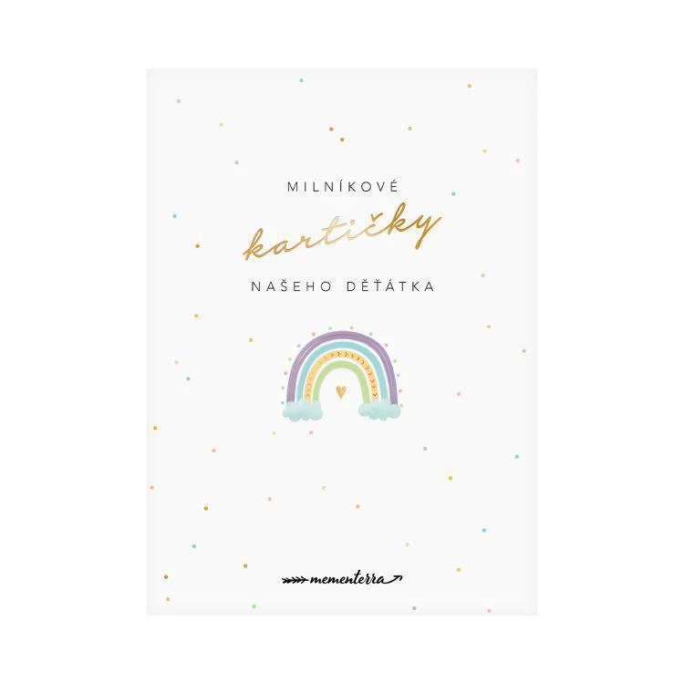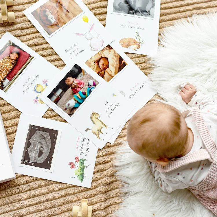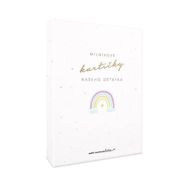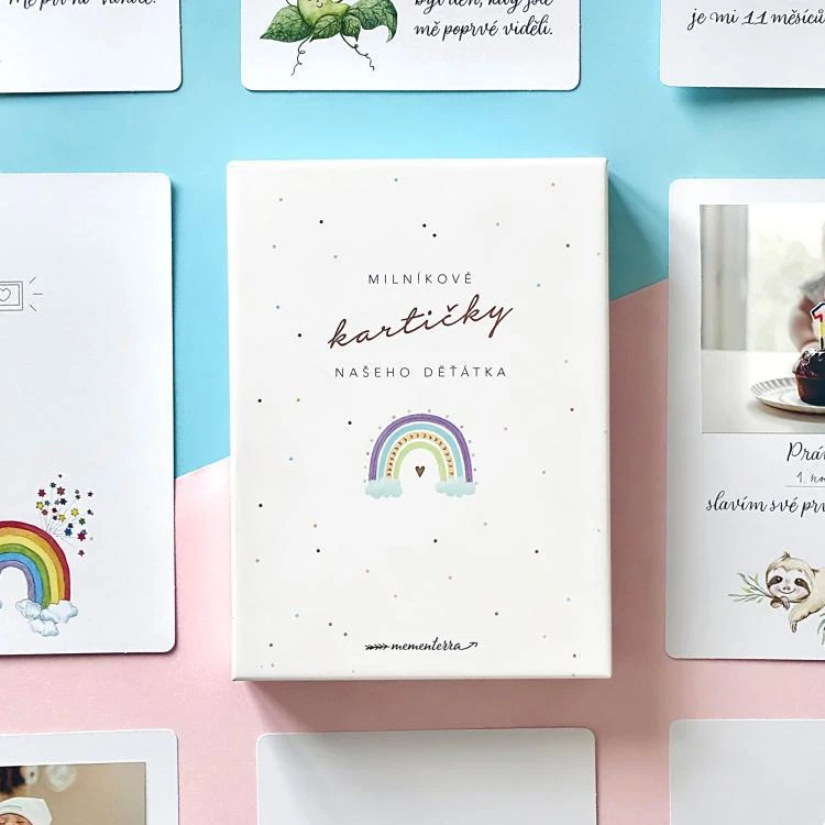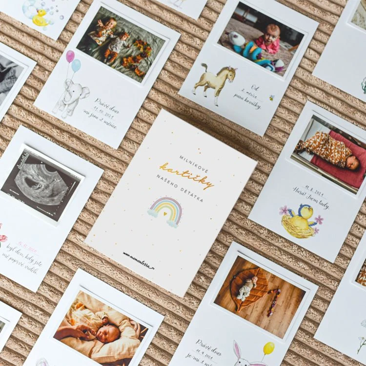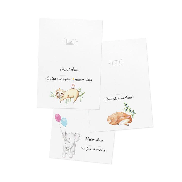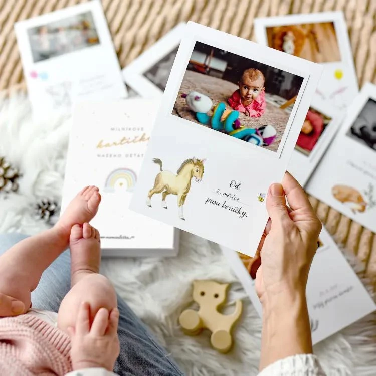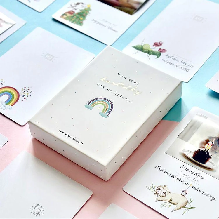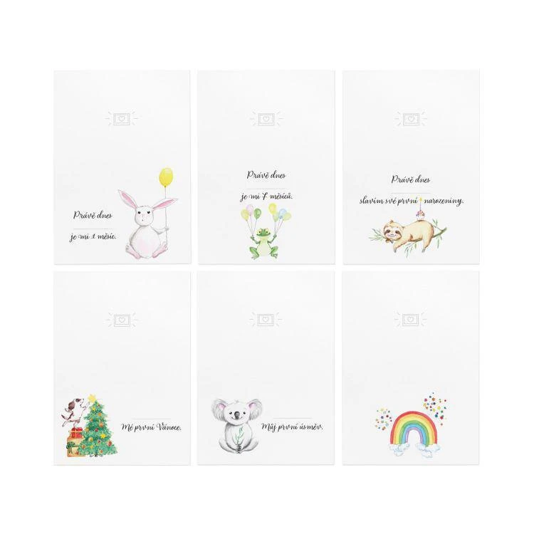 Sada obsahuje: 12 kartiček 1. - 11. měsíc a 1. narozeniny, 15 kartiček pokroků a zážitků, 5 univerzálních kartiček s možností vepsání si milníků, které jsou důležité právě pro vás a luxusní krabičku.