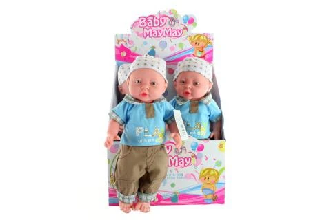 Panenka miminko chlapeček oblečený do trička, kalhot a čepice. Oblečení lze sundat, je na suchý zip. Panenka má tvrdé plastové tělíčko.