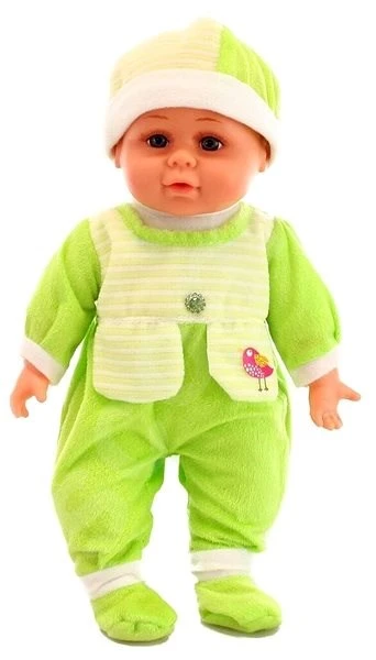 Miminko s měkkým tělíčkem. Po stlačení tělíčka začne miminko vydávat zvuky (smích, pláč, mama, tata). Miminko je oblečeno do barevného pyžámka, které lze sundat (suchý zip).