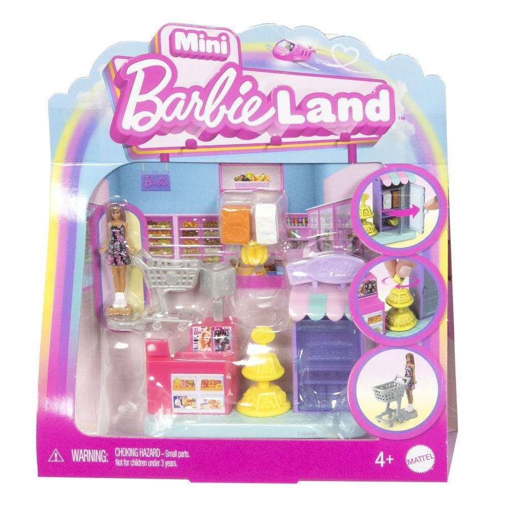 Herní set obsahuje interaktivní hrací plochy, jako jsou police s výrobky, prostor s pokladnou, nákupní košík a miniaturní téměř 4 cm velkou panenku Barbie!
