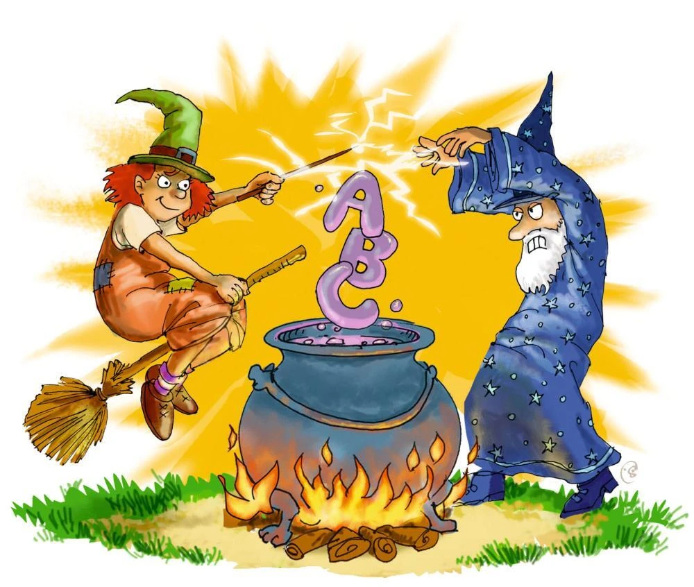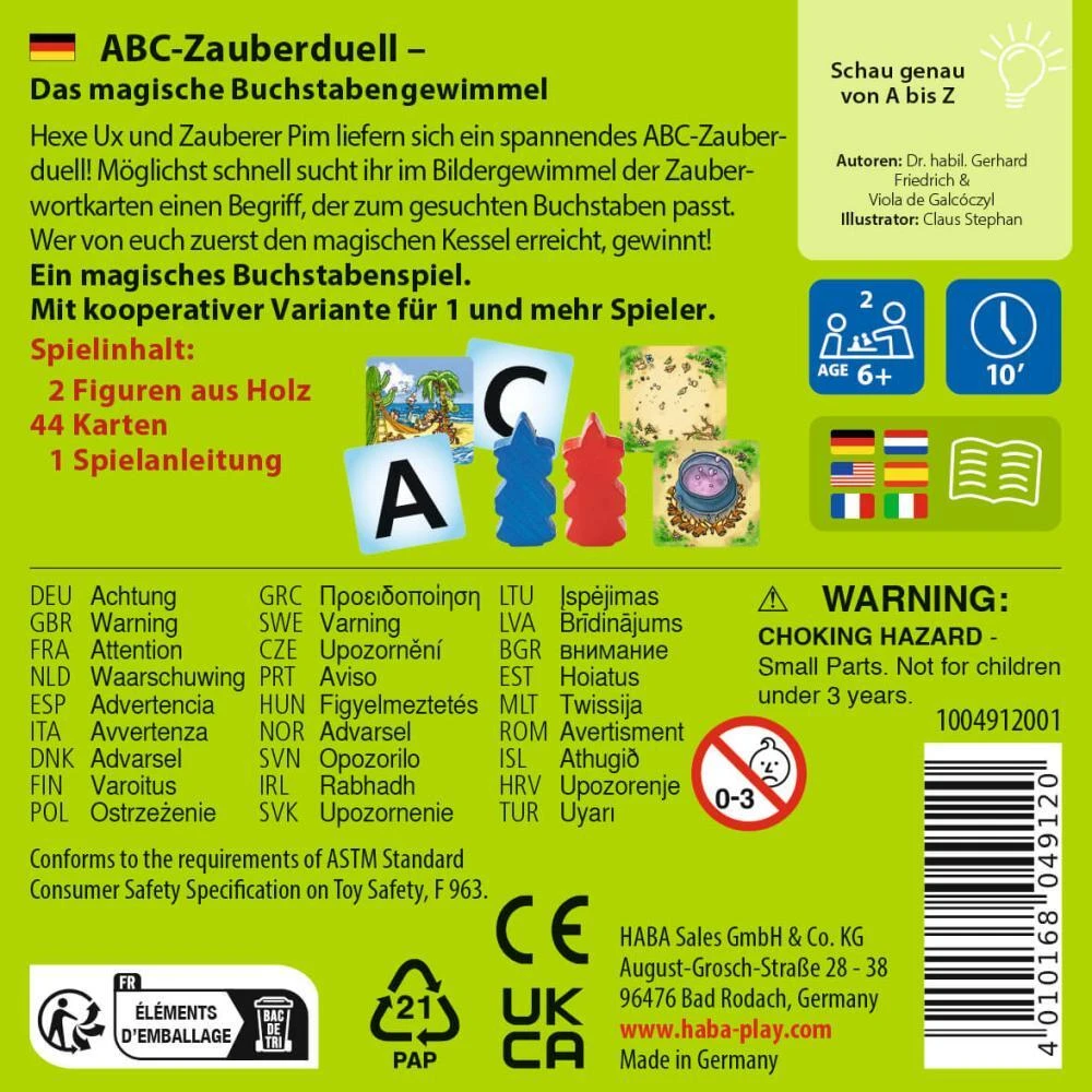 Čarodějnice a čarodějník se v temném zakletém lese postaví proti sobě v vzrušující soutěži: Který z dvou kouzelníků zná nejsilnější kouzelné slovo? Jen s rušnou kartou s kouzelným slovem, kartou s písmeny a zábavou při hledání slov je možné ho najít. Aby hráči vyhráli tento složitý souboj ABC, musí rychle najít kouzelné slovo. K tomu odhalí kartičku s písmenkem a kartičku s kouzelným slovíčkem. Teď každý současně hledá slovo na obrázku skrytého předmětu na kartě kouzelného slova, který začíná odhaleným písmenem. Kdo září dobrým okem a rychlými reakcemi? Jen tak může hráč vyhrát magický souboj ABC mezi čarodějnicí a čarodějníkem.