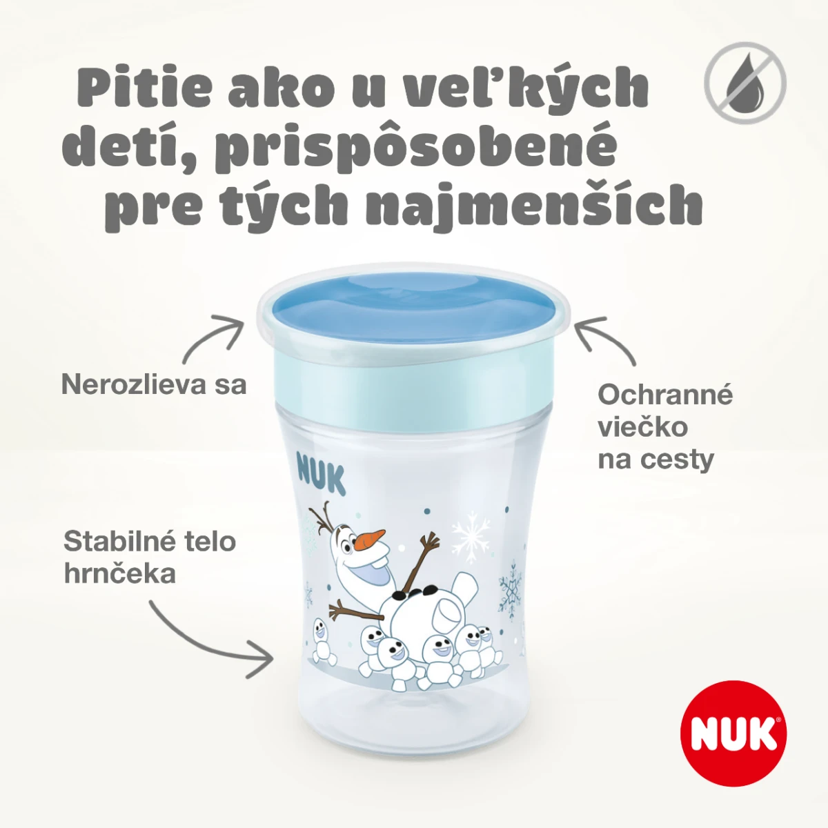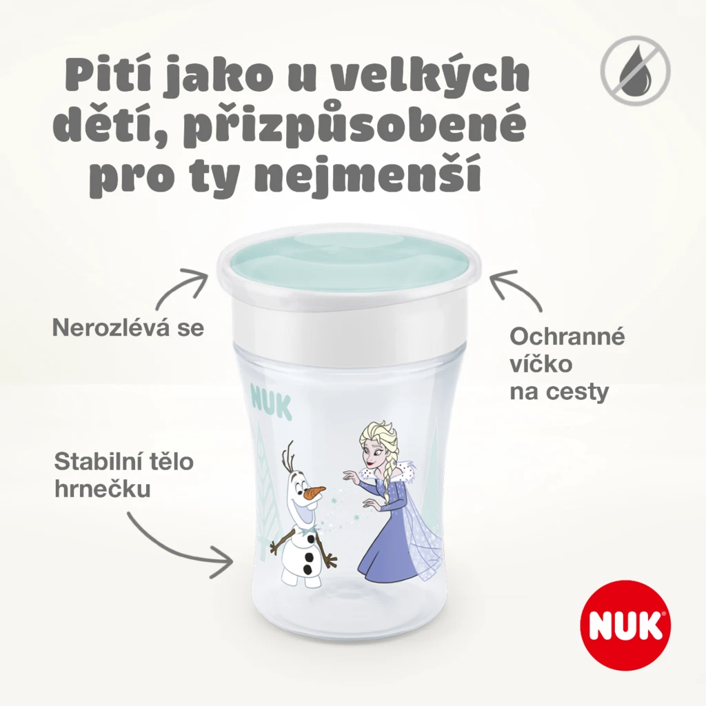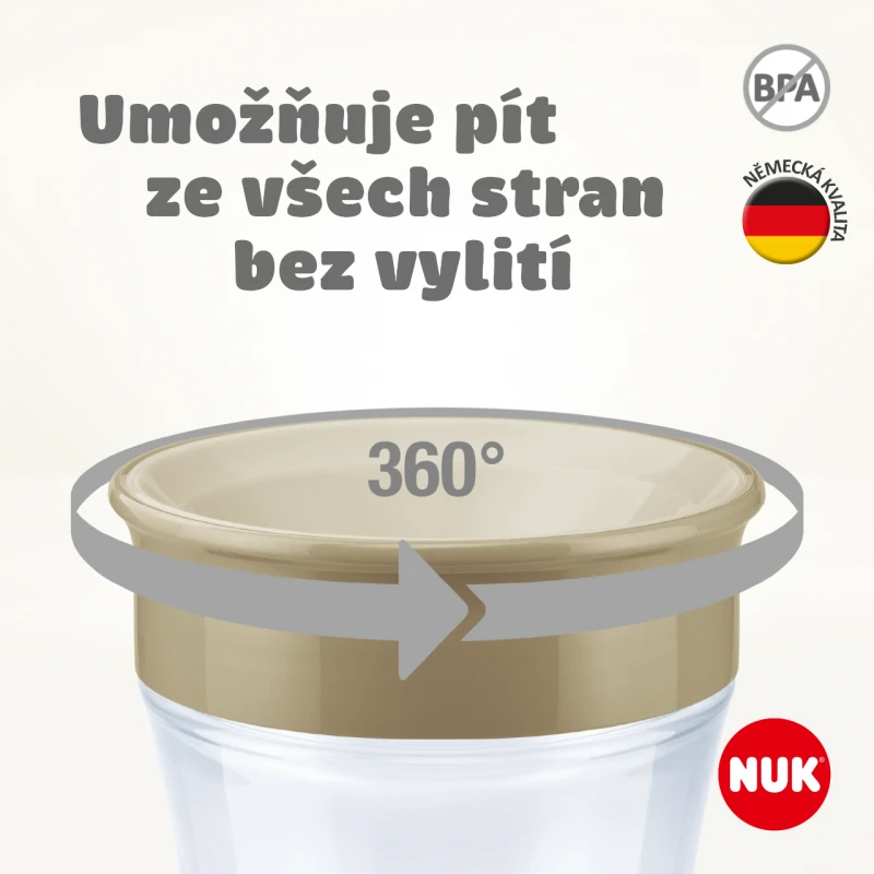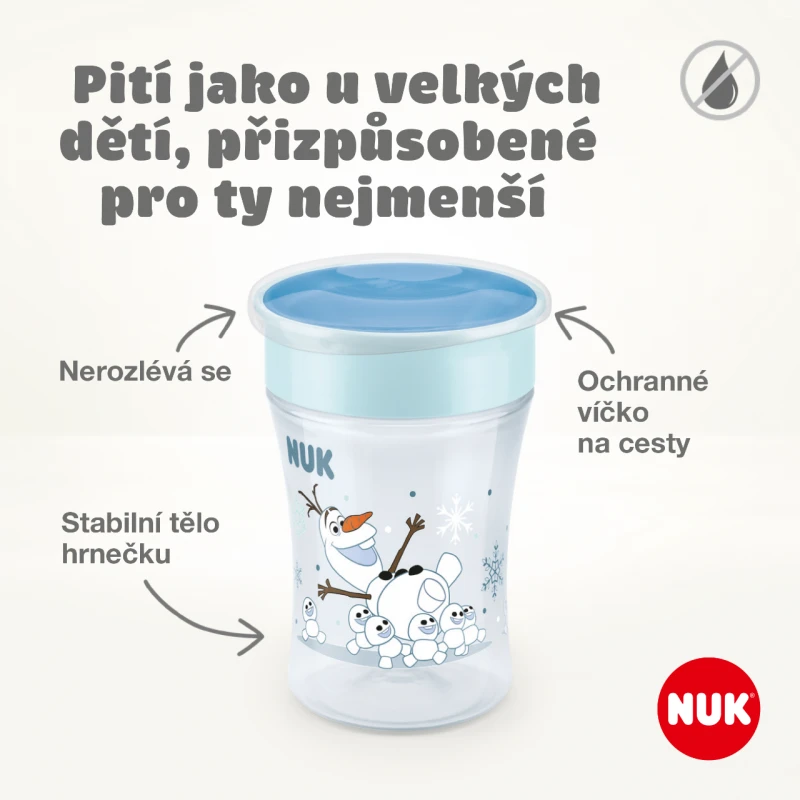 Hrneček NUK Magic Cup umožňuje malým dětem pít jako velké děti. 360° pitný okraj podporuje a pomáhá pít ze všech stran – žádná držátka a pití téměř jako z normálního hrnečku. Jediný „kouzelný rozdíl“ je ten, že tekutina z hrnečku nevyteče díky silikonovému disku, který utěsňuje víčko zevnitř. Pití je dětská hra – stačí jednoduše sát okraj hrnečku.