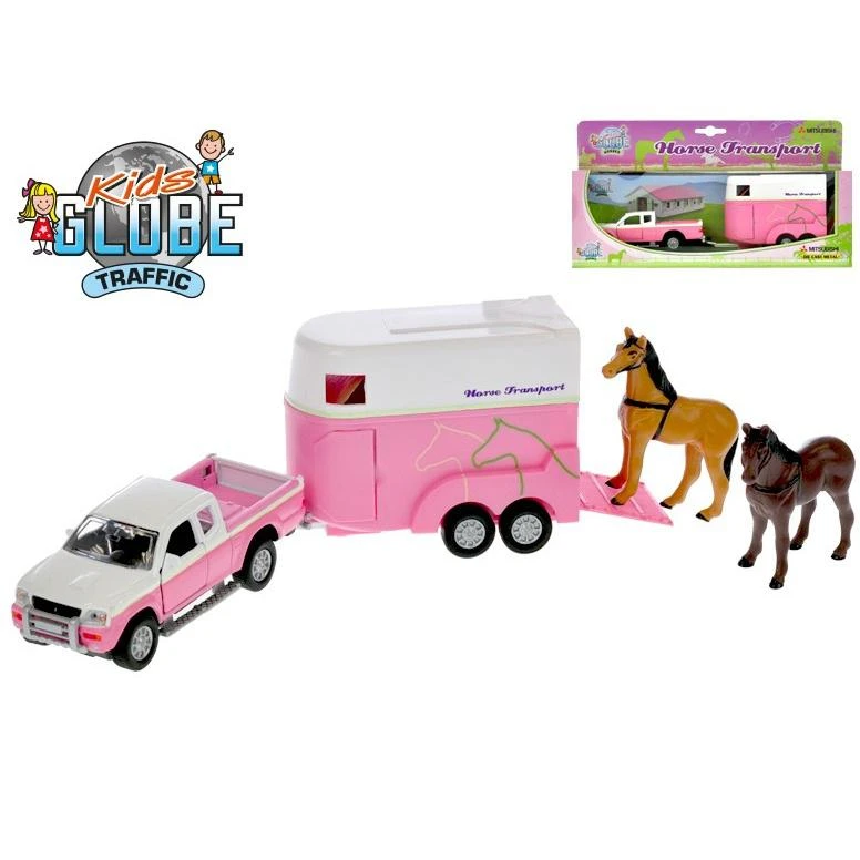 Auto s přívěsem pro koně v krabičce. Auto Mitsubishi Pajero o rozměru 13cm, na zpětný chod. Otevíratelné dveře, nákladní prostor i dveře od přívěsu. Balení obsahuje i dvě figurky koníků. Koně mají tyto rezměry: délka 7,5cm, celková výška 6,5cm, výška hřbetu od země 5cm.