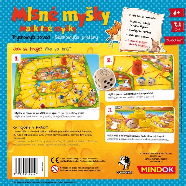 Obsahuje: 1 herní plán, 1 dřevěná kočka, 18 dřevěných myšek ve čtyřech barvách, 20 různě velkých porcí sýra, 1 velká dřevěná kostka, česká a slovenská pravidla hry.