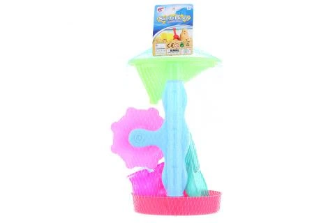 Plastový mlýnek na písek spolu s lopatkou a bábovičkami.
