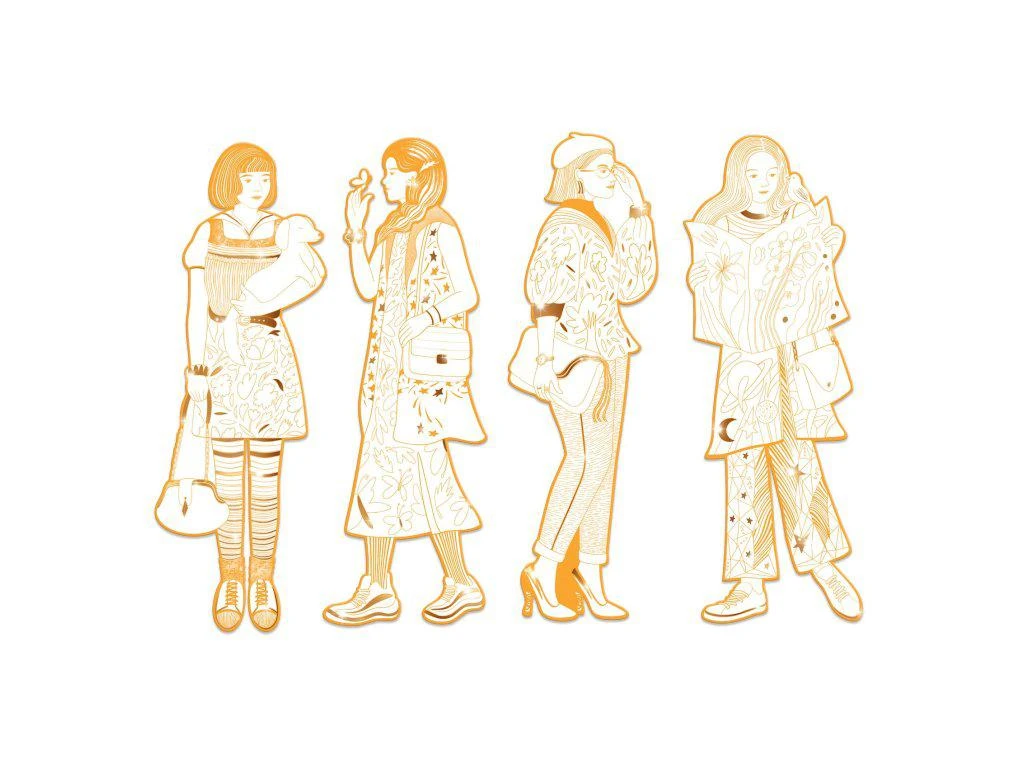Čtyři velké obrysy (32 cm vysoké) nabízejí oblečení pokryté vzory a zdobené lesklými plochami, aby modely vypadaly ještě lépe. Modelky jsou vyřezány z odolného, tvrdého kartonu, takže hotové výtvory dětem dlouho vydrží na hraní nebo jako dekorace.