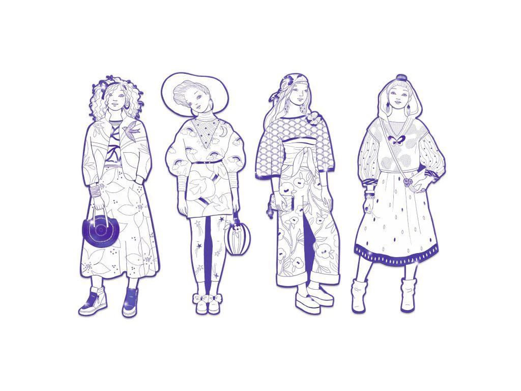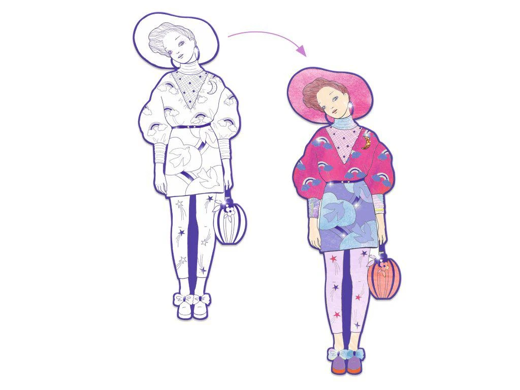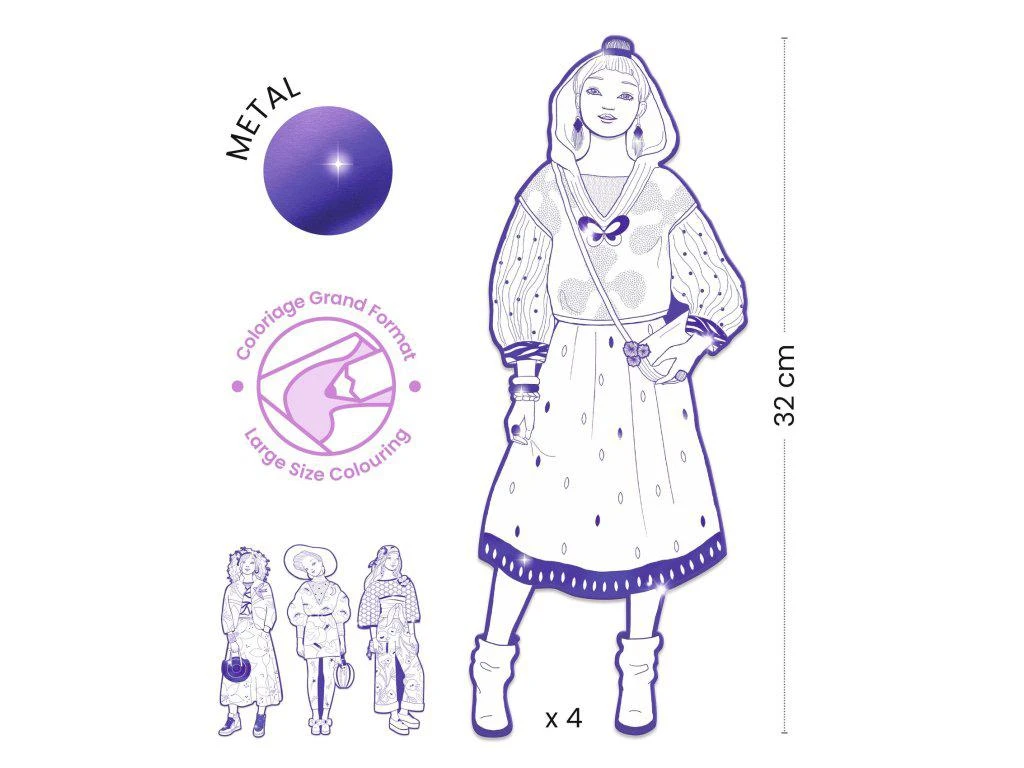 Čtyři velké obrysy (32 cm vysoké) nabízejí oblečení pokryté vzory a zdobené lesklými plochami, aby modely vypadaly ještě lépe. Modelky jsou vyřezány z odolného, tvrdého kartonu, takže hotové výtvory dětem dlouho vydrží na hraní nebo jako dekorace.