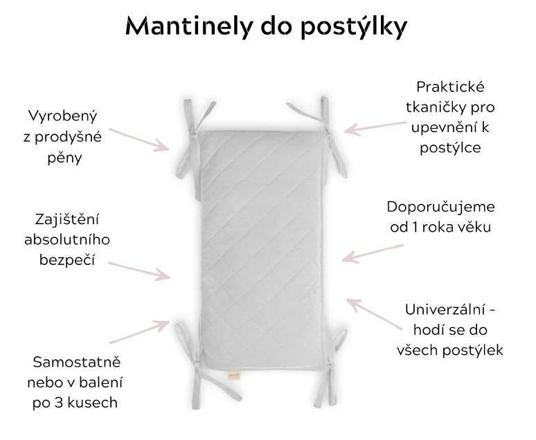 Upozornění: Z bezpečnostních důvodů doporučujeme mantinel používat po 1. roce dítěte. V tomto věku se dítě začíná v postýlce více pohybovat a mantinel ochrání hlavičku před nechtěným nárazem.