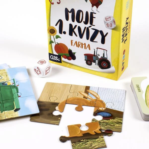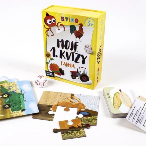 Hry Moje 1. kvízy obsahují: 50 kartiček s obrázky s 300 otázkami ve 2 úrovních obtížnosti, hrací kostku, 6 motivů puzzle - každé složené z 6 dílků a pravidla.