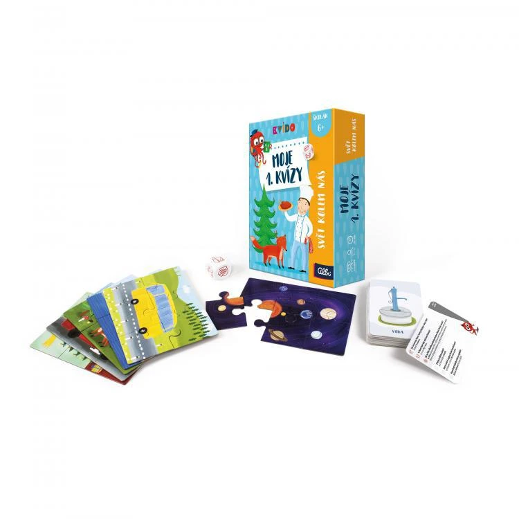 Hry Moje 1. kvízy obsahují: 50 kartiček s obrázky s 300 otázkami ve 2 úrovních obtížnosti, hrací kostku, 6 motivů puzzle - každé složené z 6 dílků a pravidla.