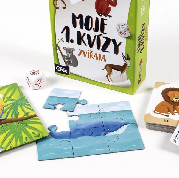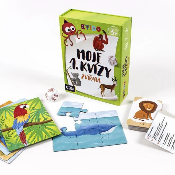 Moje první kvízy je 50 kartiček s 300 otázkami rozdělenými podle věku dětí, aby mohli hrát společně i starší sourozenci. Za správné odpovědi získávají děti 1 dílek puzzle a vyhrává ten, kdo jako první složí obrázek.