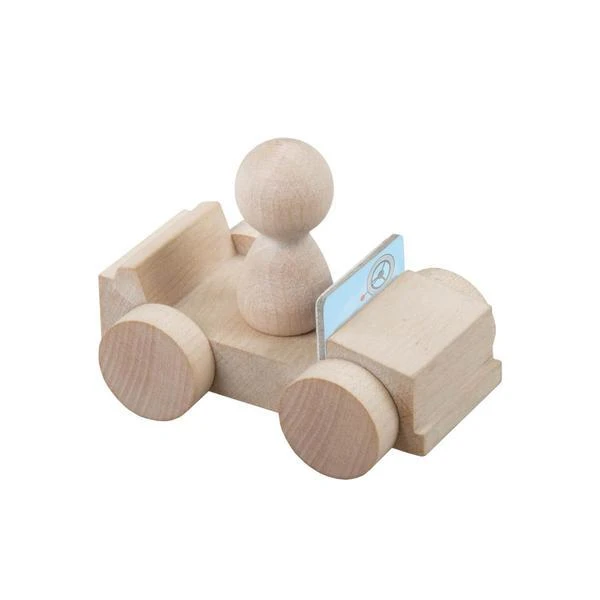 Balení obsahuje: 1 herní plán s otočnou šipkou, 18 kartonových tvarů v 6 tabulkách, 1 dřevěná figurka, 1 stavebnice dřevěného autíčka